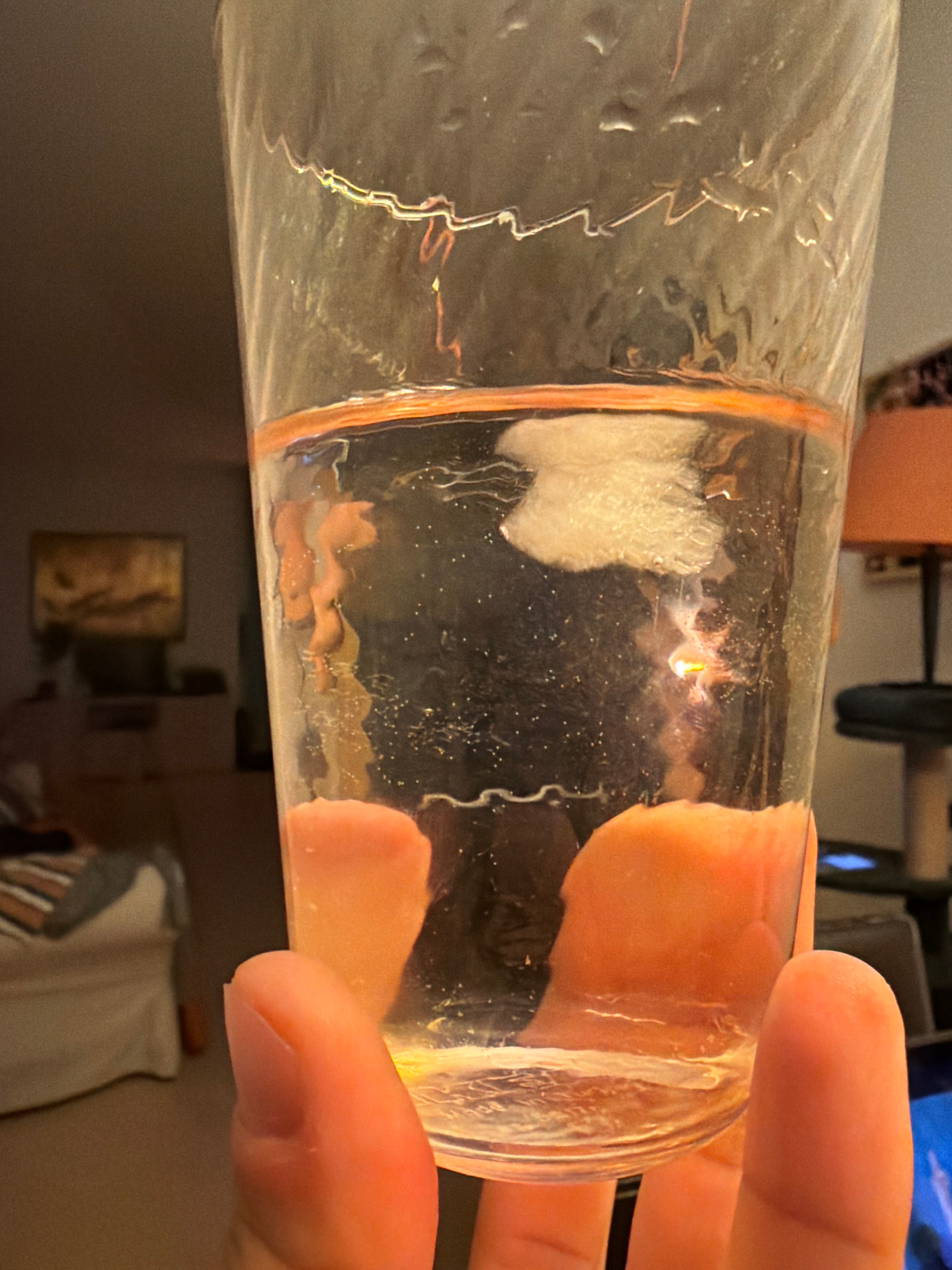 A hand is holding a transparent glass filled with a cloudy, semi-opaque liquid. The hand, with pinkish skin, is obscuring a significant portion of the glass. Inside the glass, there are various partic…read more