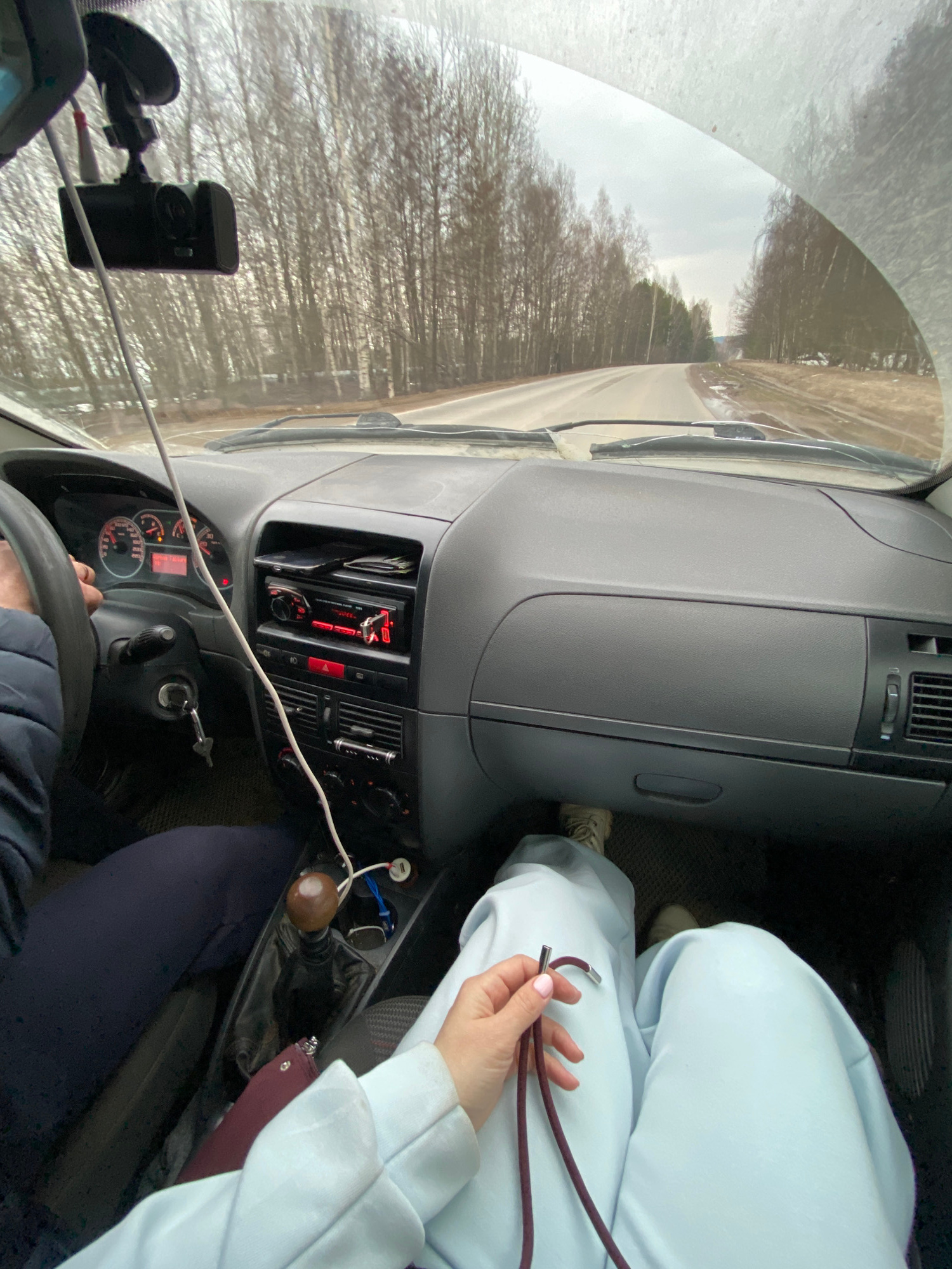 The image depicts the interior of a car, from the driver's perspective, suggesting motion based on the blurred background. The scene features two individuals: the driver and a passenger. The driver's…read more
