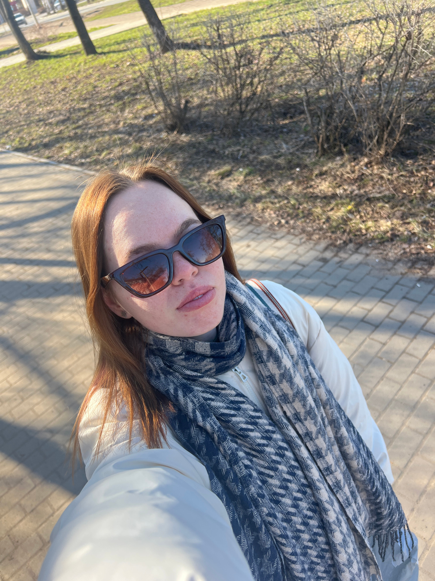 A person wearing sunglasses and a scarf is positioned in front of a brick sidewalk with trees and vegetation visible on the left side of the frame. The photo appears to be taken in Chaikovsky, Russia.…read more