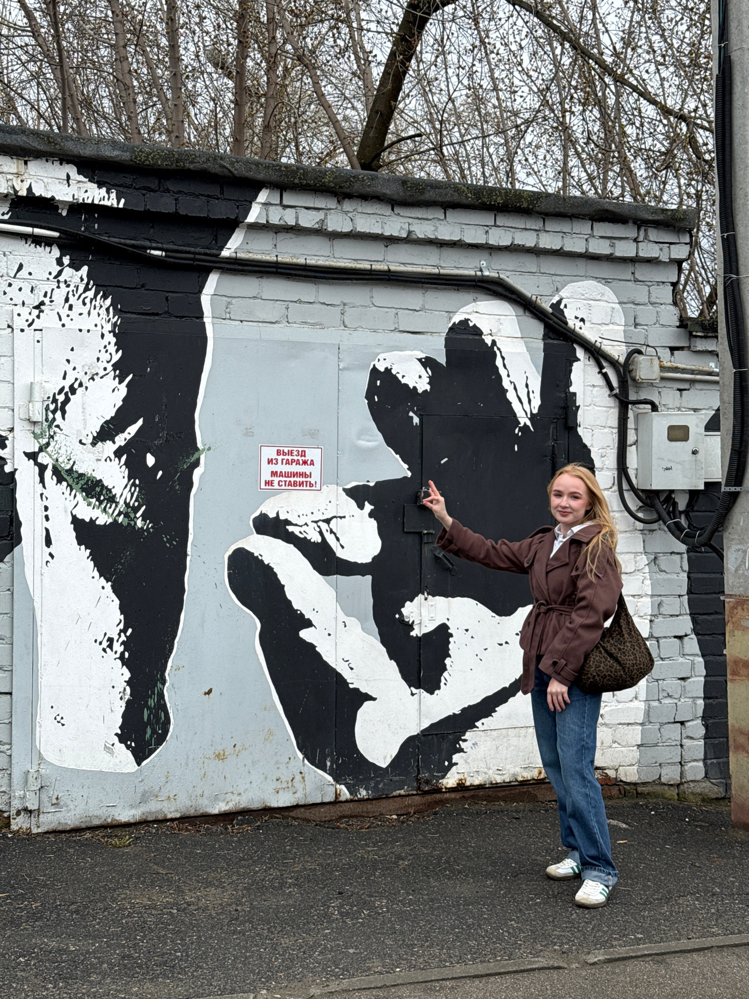 A photograph taken outdoors in the city of Perm, Russia, shows a young woman standing next to a garage door painted with a black and white mural depicting two hands nearly touching. The mural appears…read more