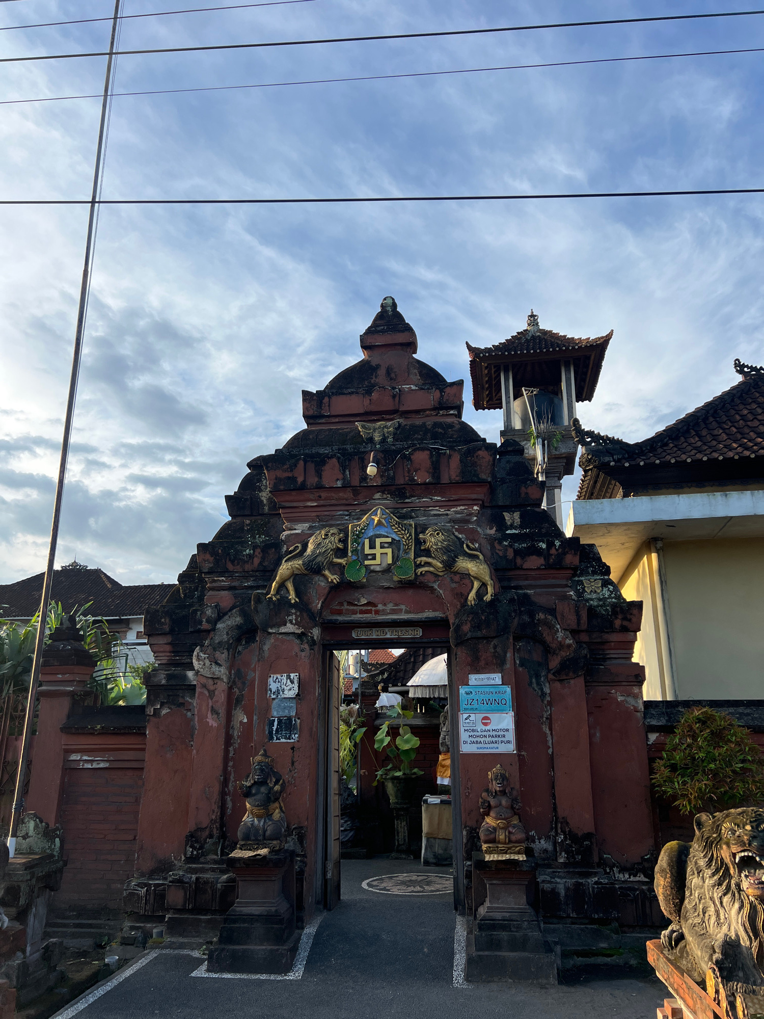 The image shows a weathered, ornate gate structure in Singapadu, Indonesia. The gate is primarily red with dark accents, constructed of brick and stone. It is adorned with carved figures, including li…read more