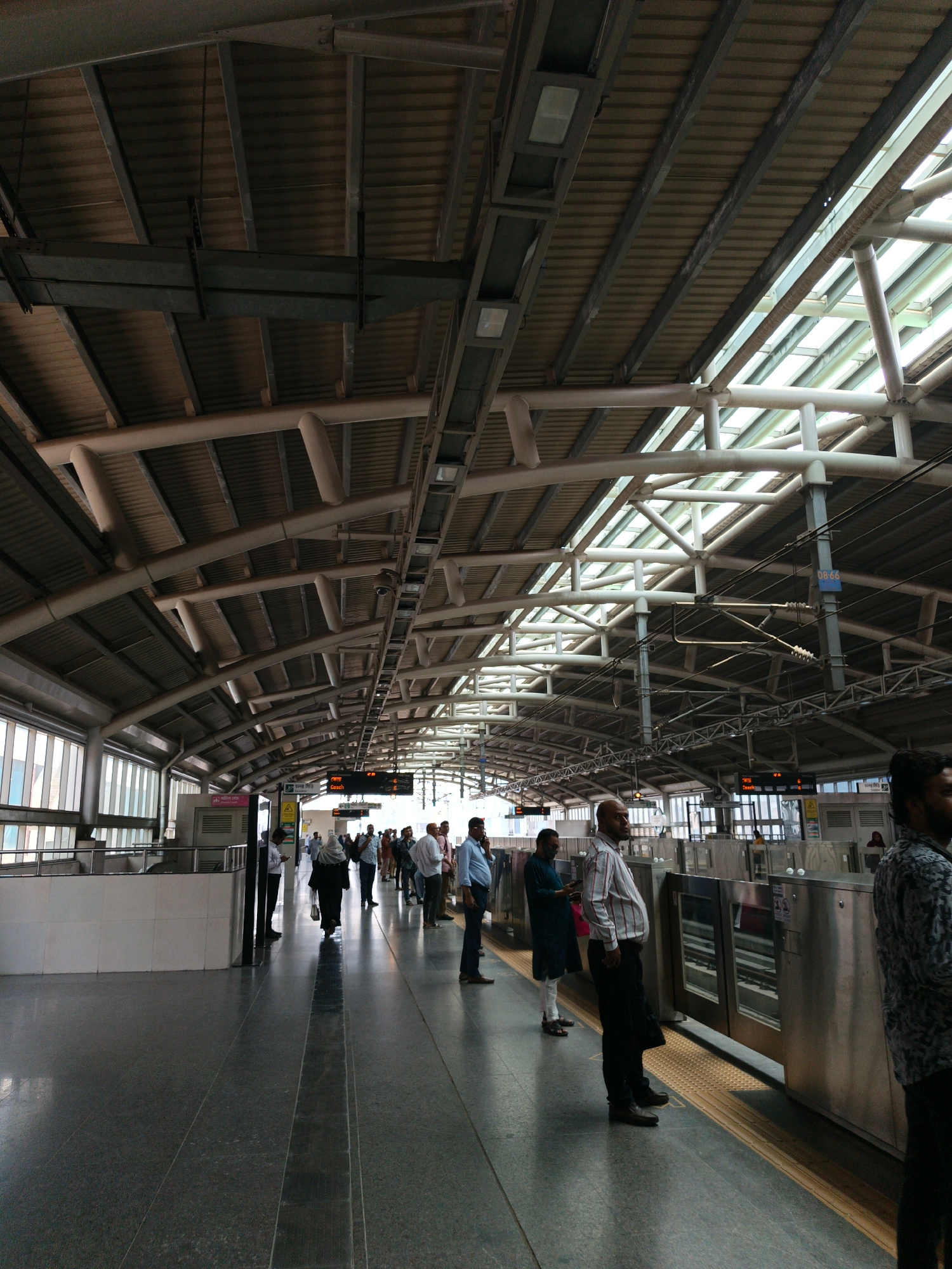 The image depicts the platform of a metro rail station in Dhaka, Bangladesh. People are standing and waiting on the gray, shiny platform. In the background, a display screen shows the coach number. Th…read more