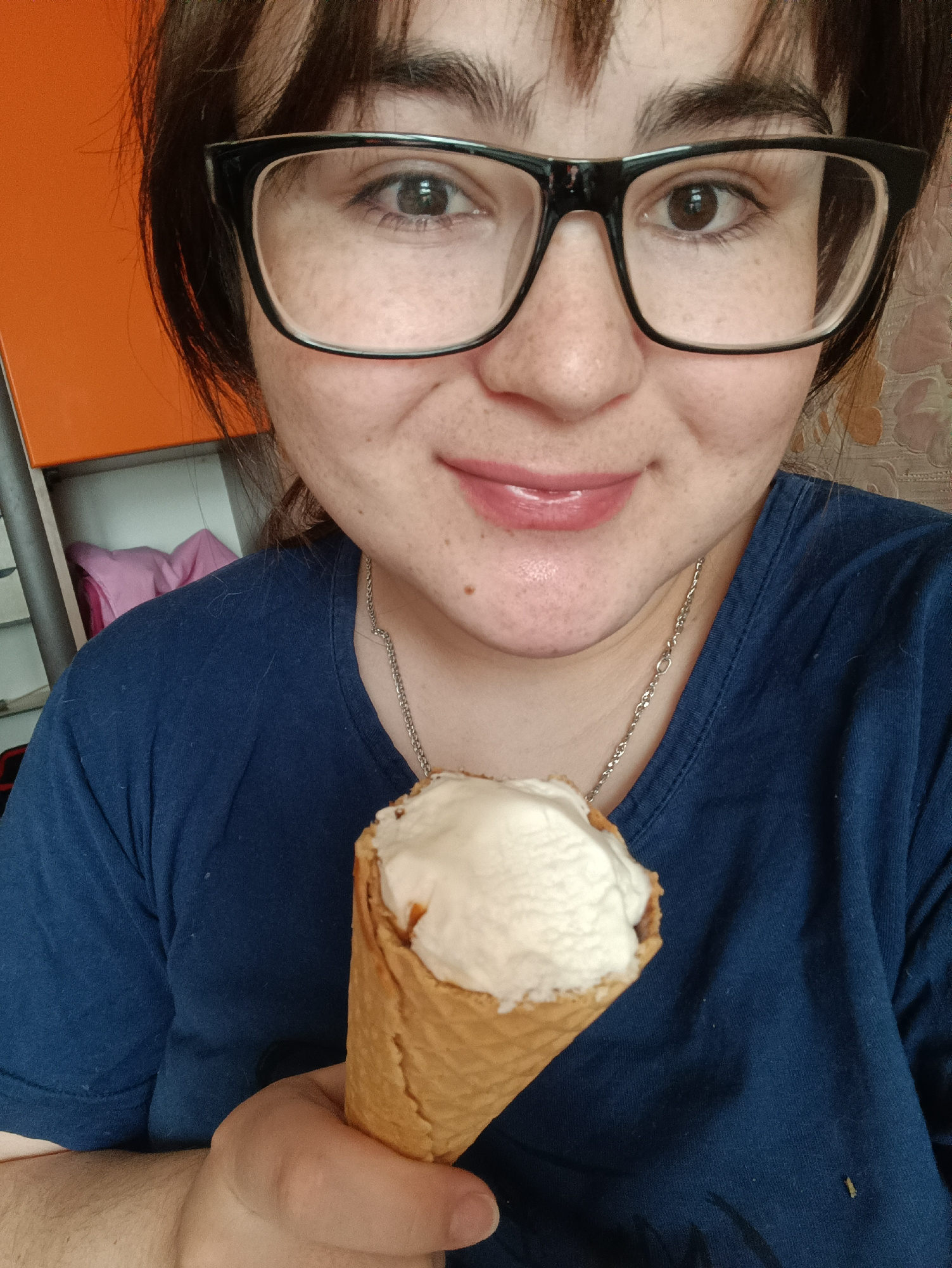 A woman with brown hair and glasses is holding an ice cream cone. She is wearing a blue t-shirt and a silver necklace. The background includes an orange cabinet. The location is likely not Noviy, Russ…read more