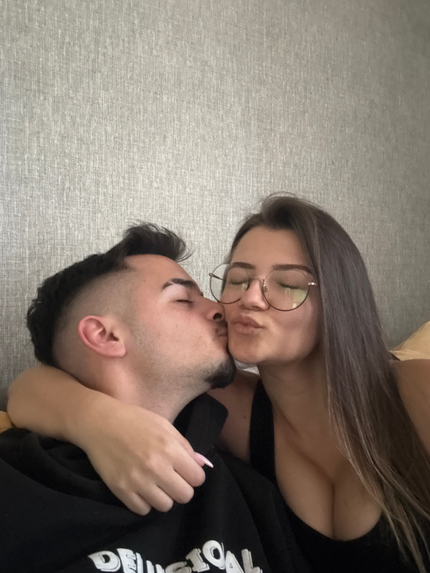 A woman with brown hair and glasses kisses a man on the cheek. The man has dark hair and stubble. The background is a gray surface. The city of Sofia, Bulgaria is not identifiable in the image.