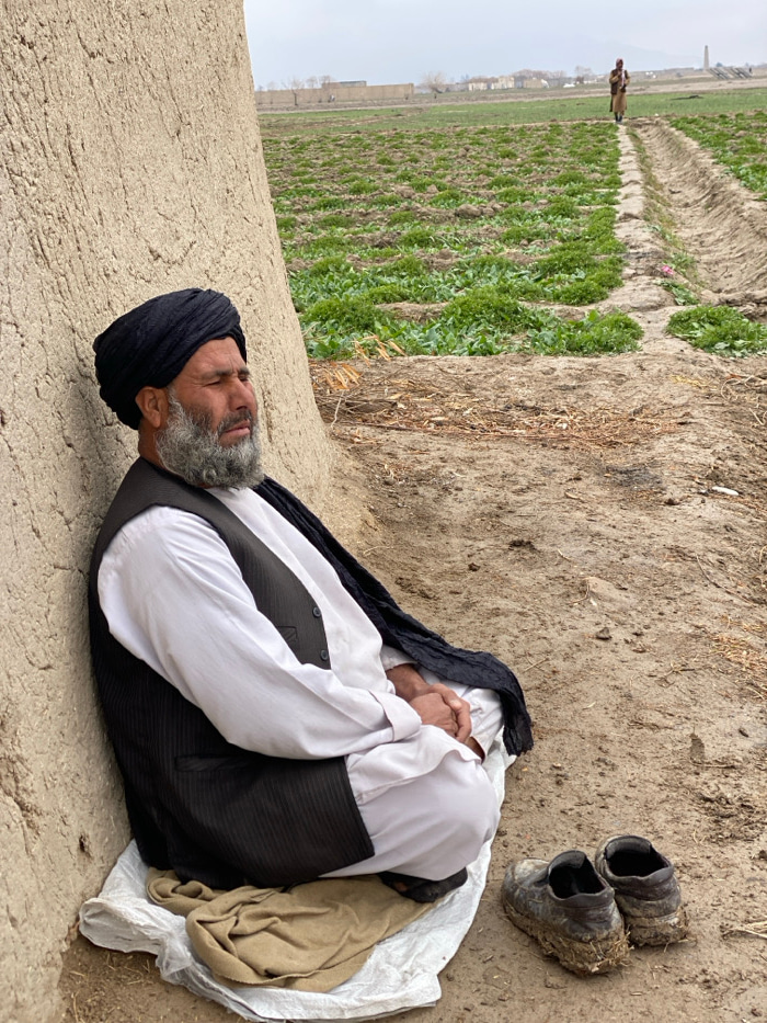 An elderly man with a grey beard and a black turban rests on a white cloth atop cracked earth. He wears a white shirt and dark vest. Next to him are muddy shoes. Behind him stretches a field with rows…read more