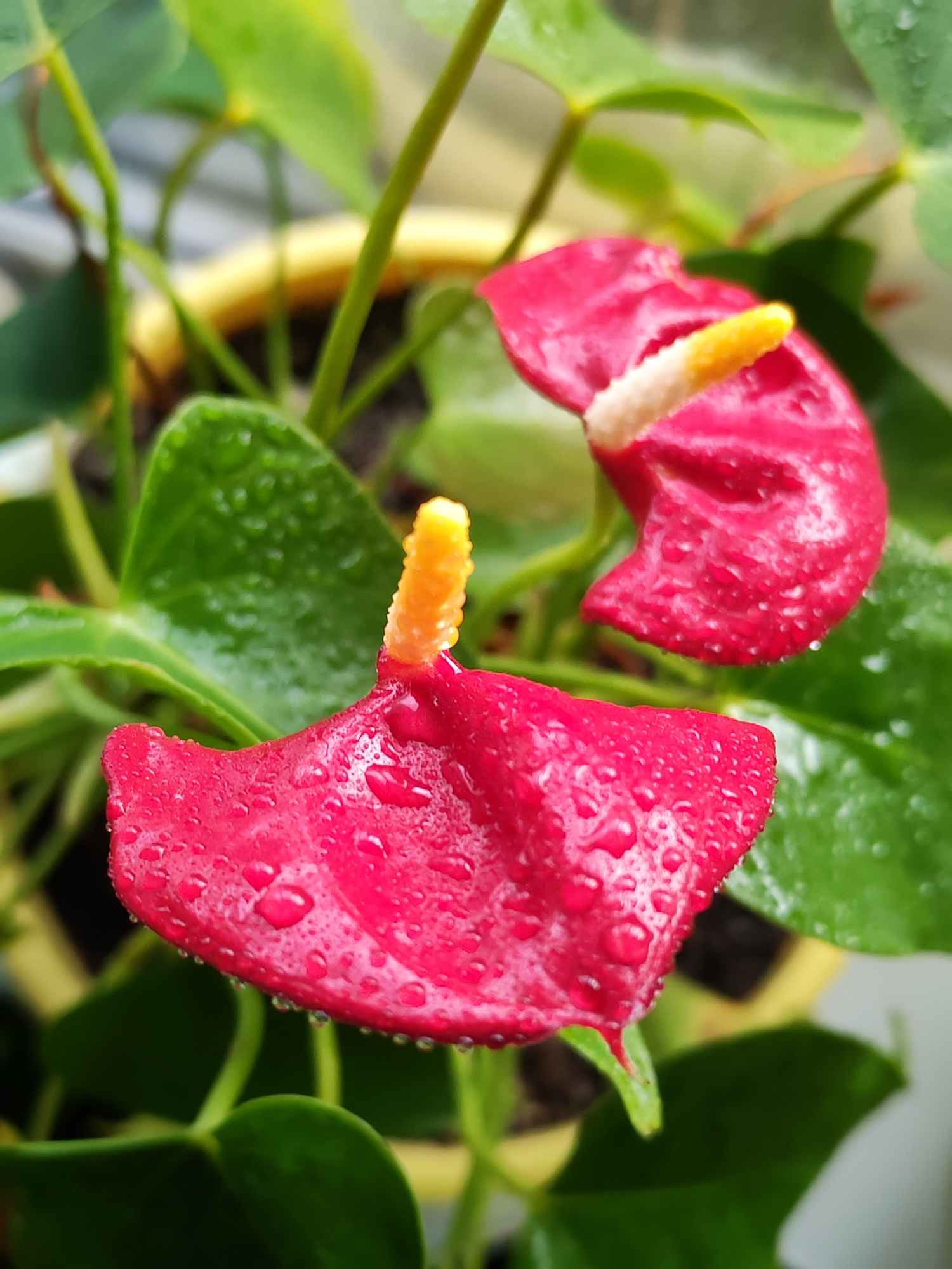 The image features a close-up of two red Anthurium flowers covered in water droplets. The flowers are positioned in the foreground, with green leaves and a yellow pot visible in the background. The ye…read more