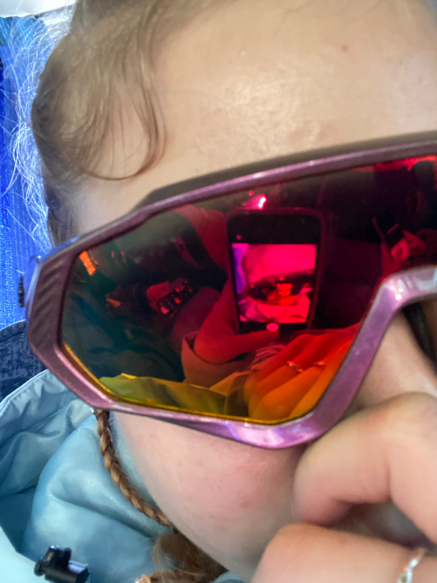 The image is a selfie taken in reflective ski goggles. The goggles have a pink frame and the reflective lenses show a reflection of a person holding a mobile phone, presumably taking the picture. The…read more