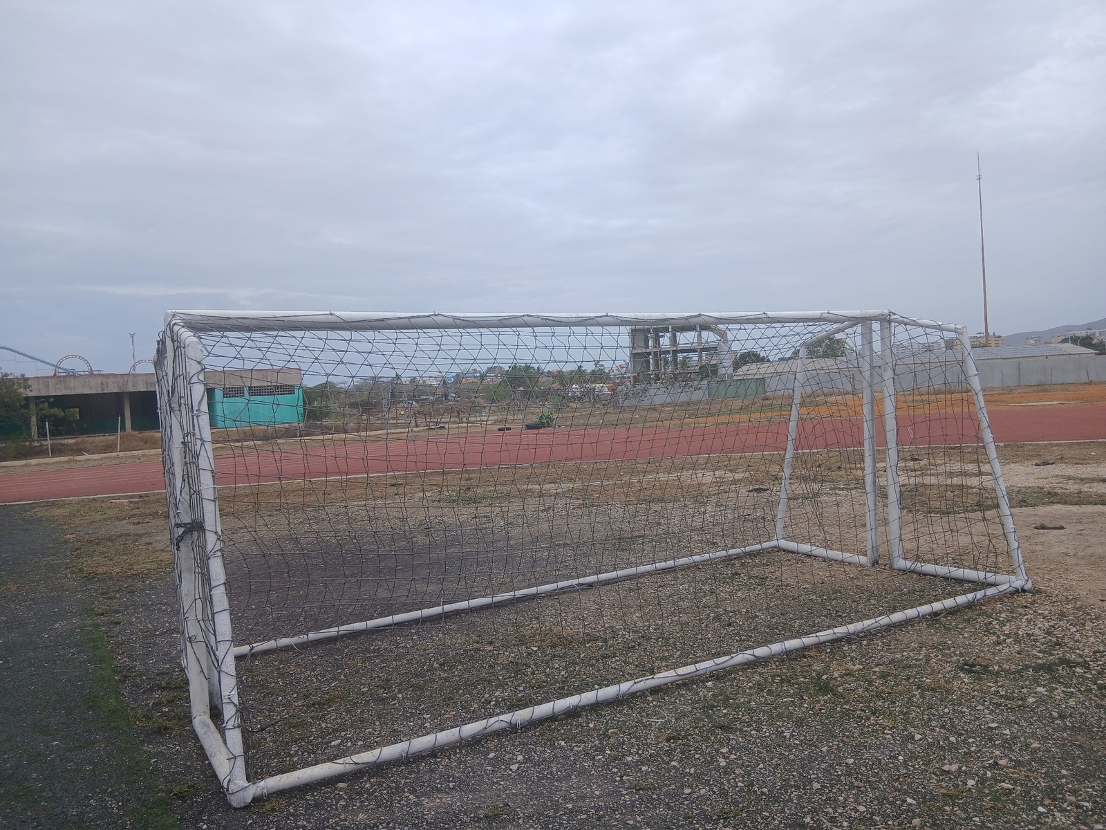The image captures an outdoor scene featuring a white soccer goal with a black net in the foreground. The goal is positioned on a ground covered with small gravel and patches of dry grass. Behind theβ¦read more