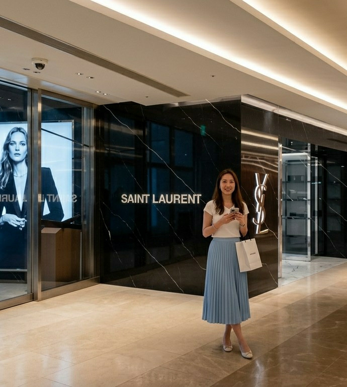 A woman stands posing inside a Saint Laurent luxury retail store, located in Chuo, Japan. The interior features a light-colored tiled floor with varying shades, and dark, possibly black, marble walls…read more