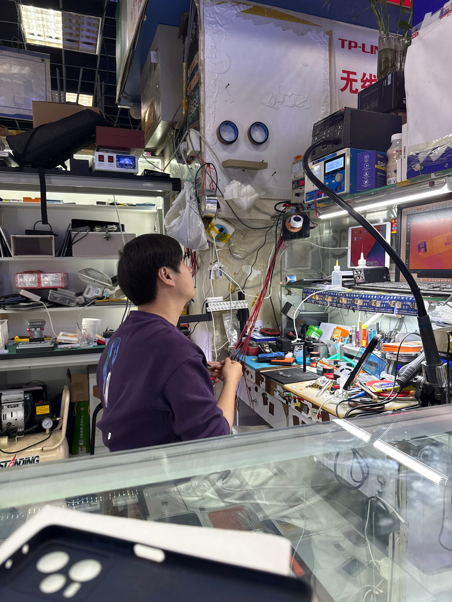 This media file captures an indoor scene, likely a small electronics repair shop or market stall, characterized by a highly cluttered but functional workspace. The image is taken from a slightly eleva…read more