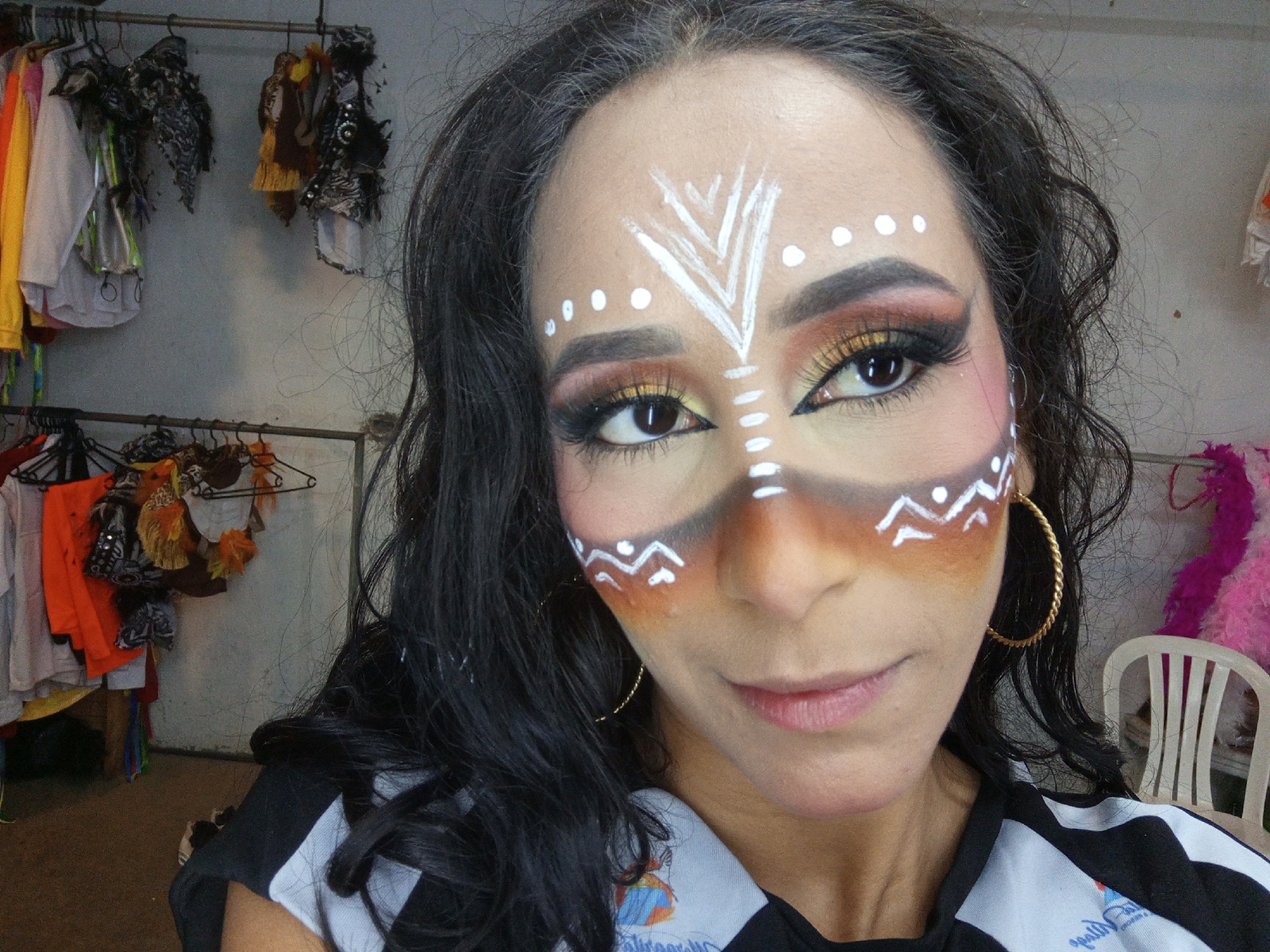 A close-up, head-and-shoulders shot captures a woman with elaborate face paint and makeup, looking directly at the camera. She has long, dark, wavy hair and wears large golden hoop earrings. Her face…read more