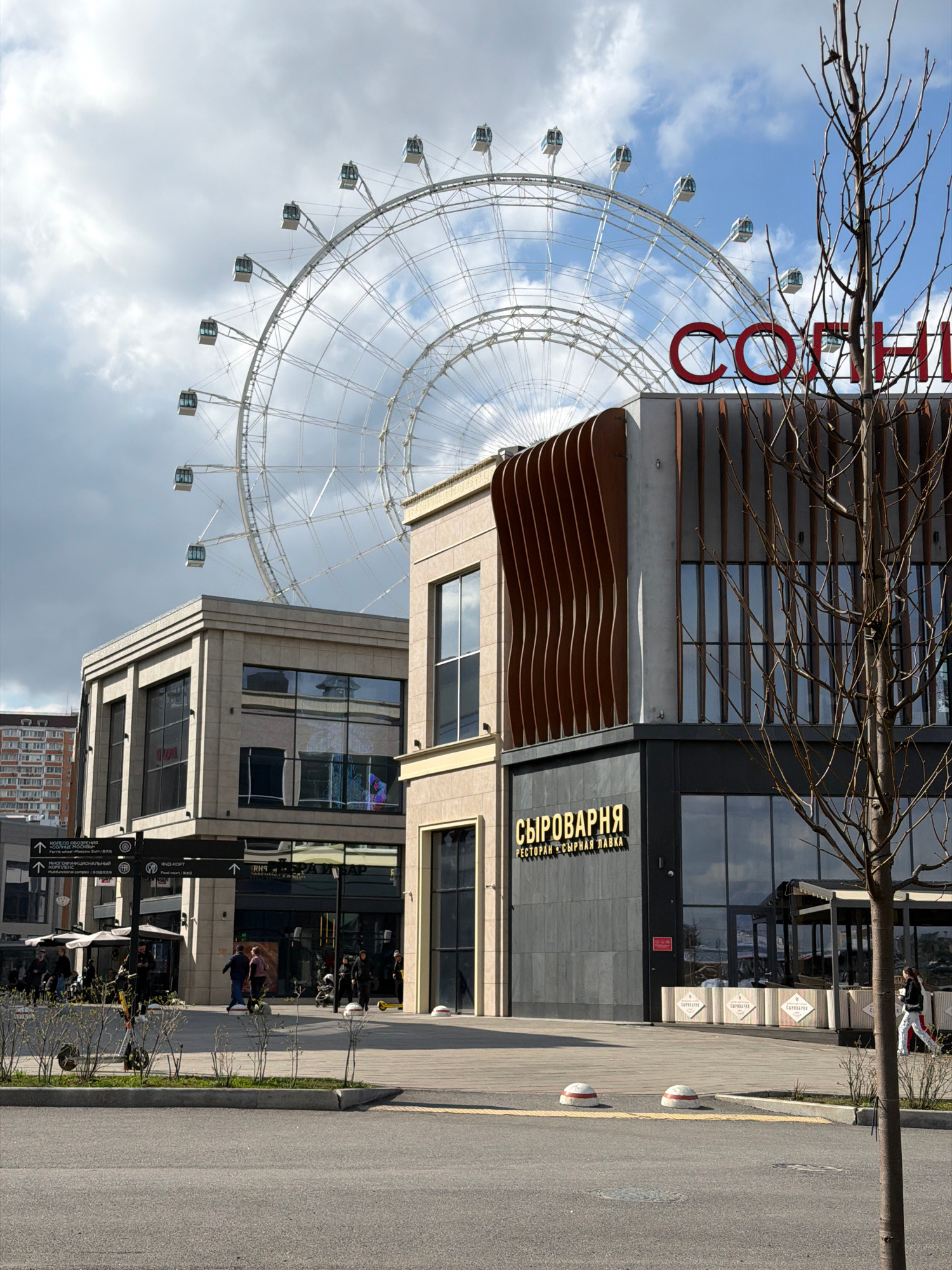 This media file captures an urban scene in Moscow, Russia, featuring the "Sun of Moscow" Ferris wheel prominently on the left. The large, white metal structure of the Ferris wheel, with its numerous e…read more