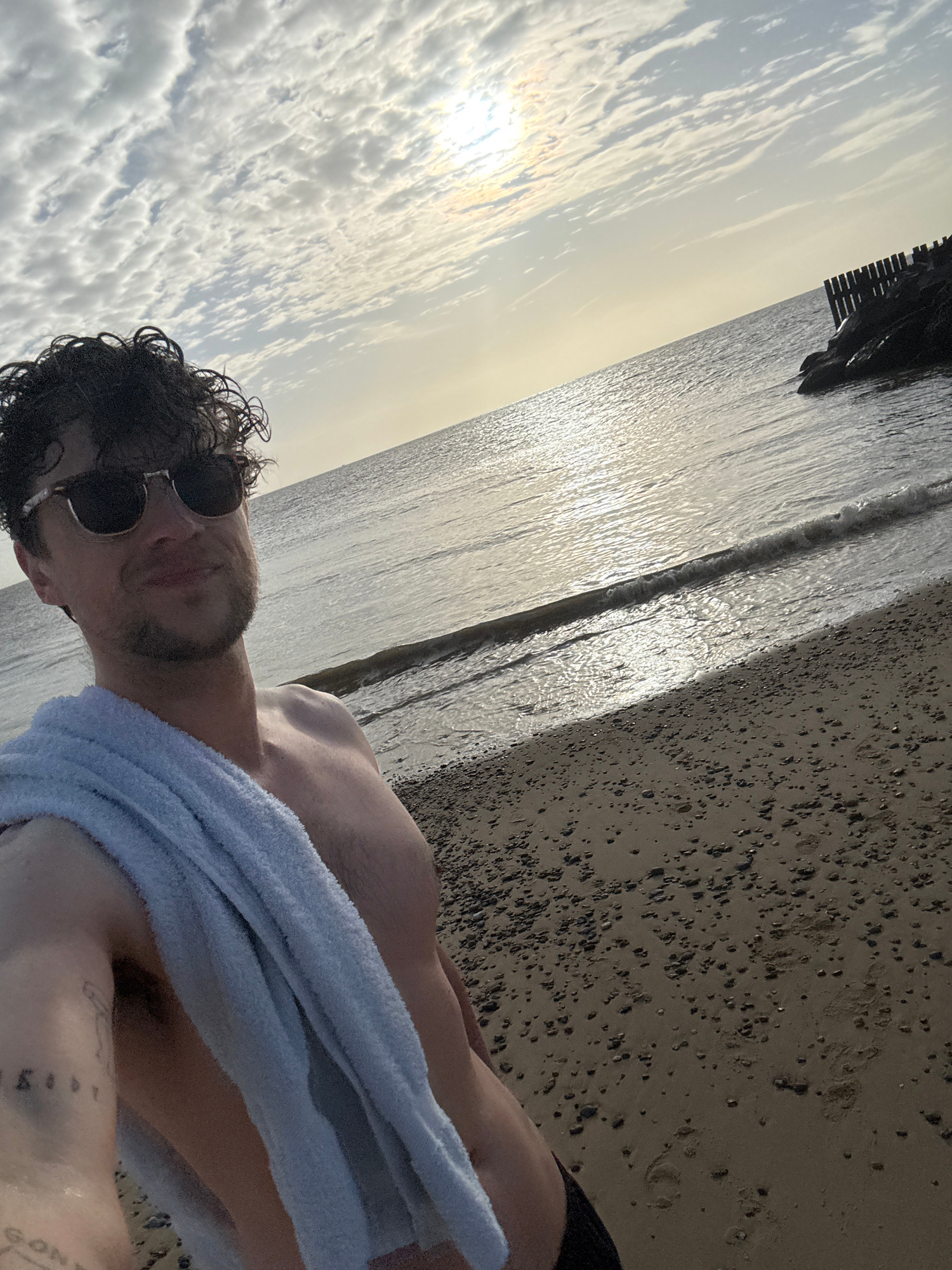 The image shows a shirtless man wearing sunglasses and a light blue towel draped over his shoulder, standing on a beach in East Suffolk, United Kingdom. The beach appears to be wet and sandy, with peb…read more