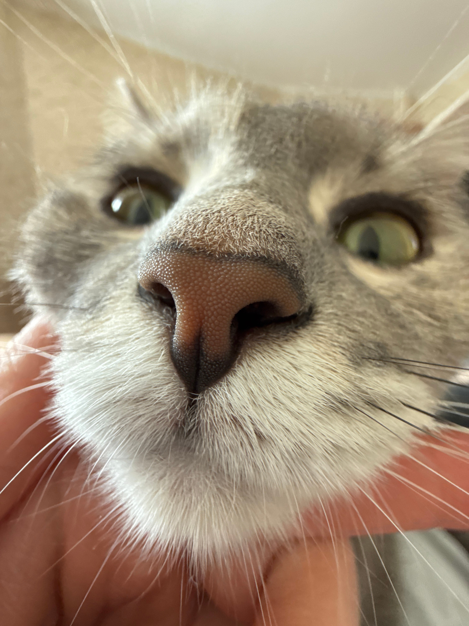 A close-up, upside-down view of a gray cat's face. The cat has green eyes and a pink nose with visible texture. The cat's whiskers are prominent and white. A hand is visible touching the fur near the…read more