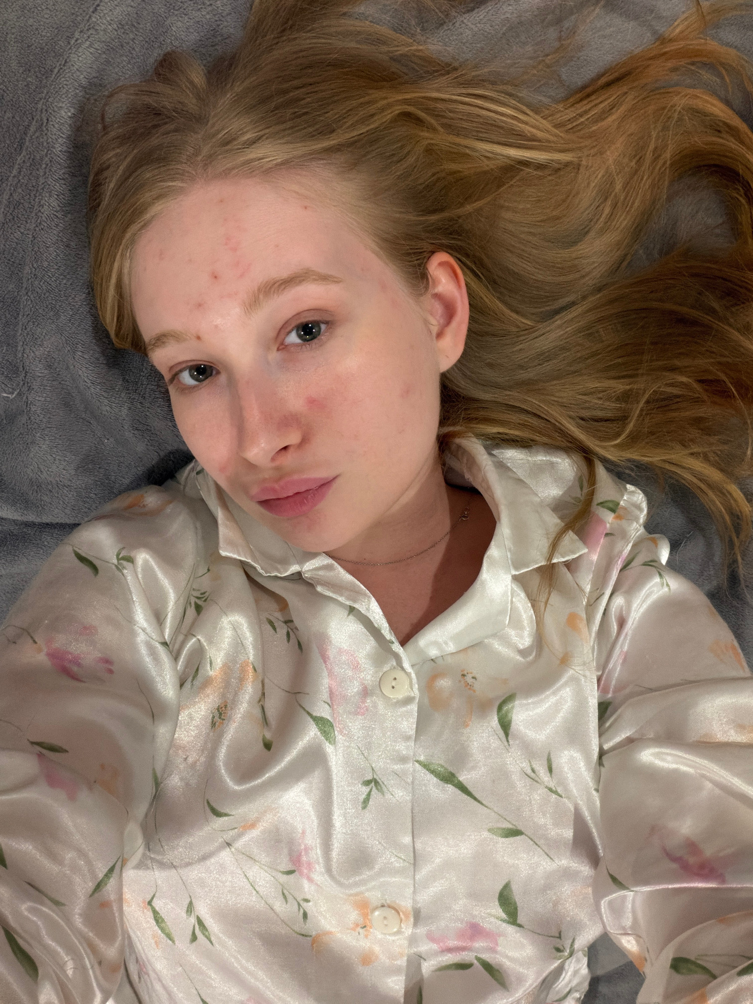 An eye-level shot depicts a young female, likely an adolescent or young adult, lying on her back on a grey, soft-textured surface, possibly a blanket or duvet. Her head is angled towards the upper lef…read more