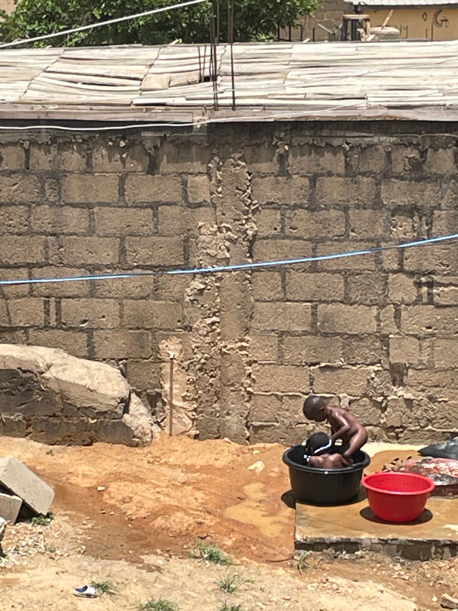 A man bathes outdoors in Jos, Nigeria. The man is bent over a black bucket, using a white cloth. A red bucket sits nearby on a concrete surface stained with spilled water. A cinder block wall forms th…read more