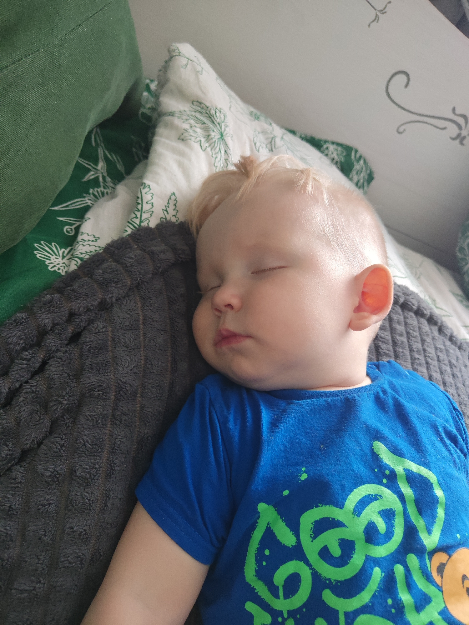 A close-up shot depicts a light-skinned baby sleeping peacefully. The baby is lying on its left side, nestled against a grey textured blanket. The baby is wearing a bright blue t-shirt with a neon gre…read more