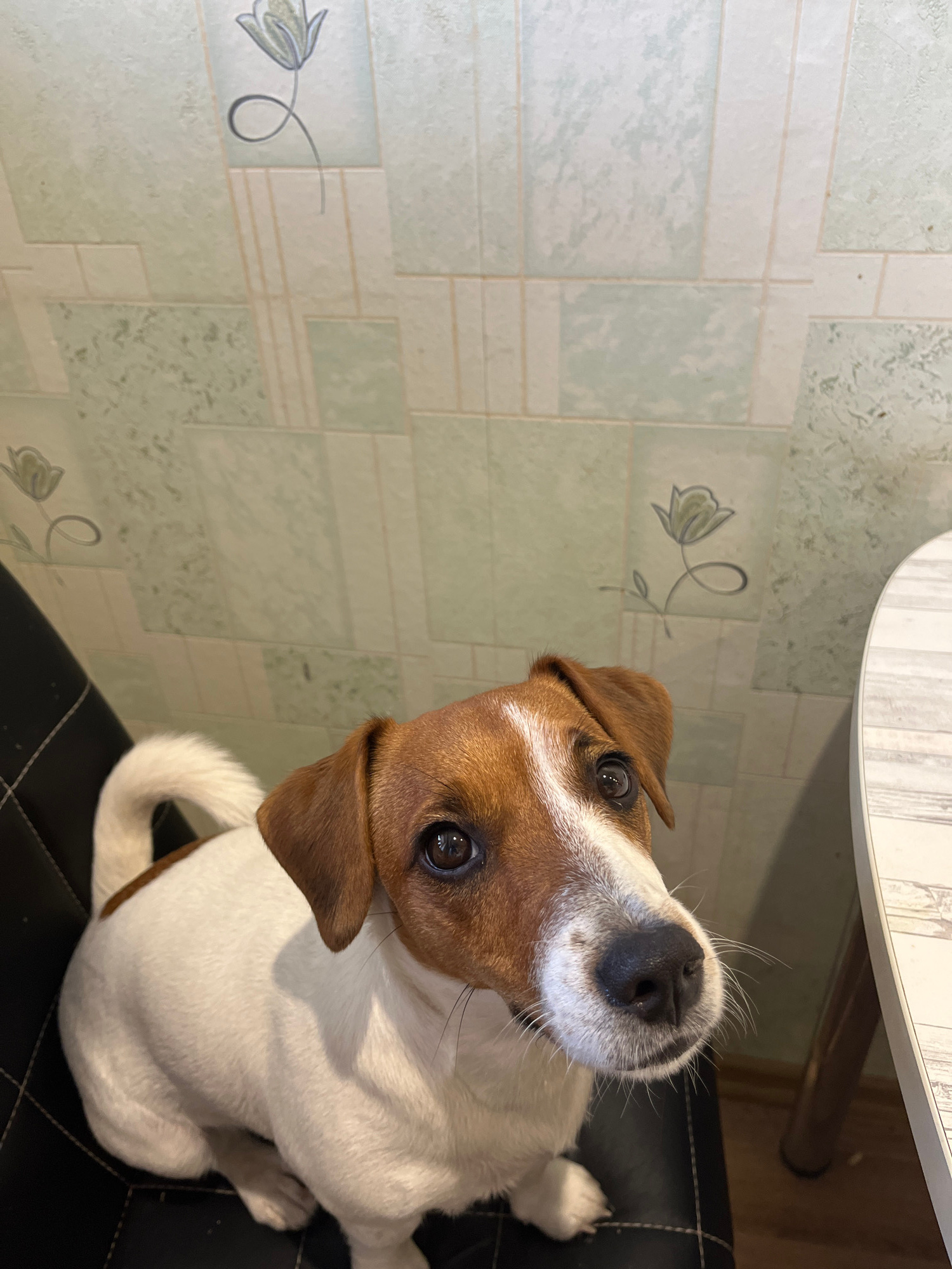 The image, taken in Chaikovsky, Russia, features a small, white and brown dog, likely a Jack Russell Terrier, sitting on a black, cushioned chair with white diamond stitching. The dog is positioned in…read more