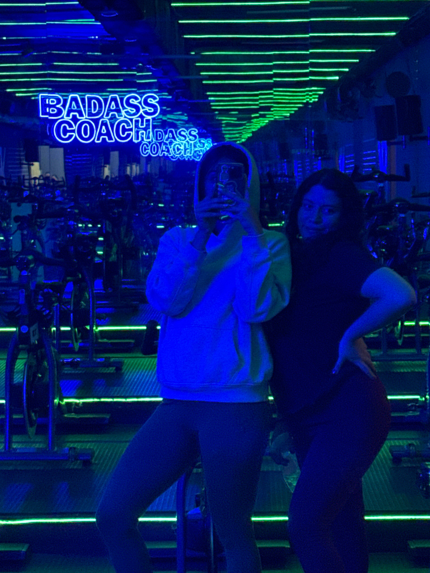 Two individuals are present in a room with neon lighting. One person is wearing a light-colored hoodie and leggings, while the other is in a dark top and leggings. A neon sign reading "BADASS COACH" i…read more