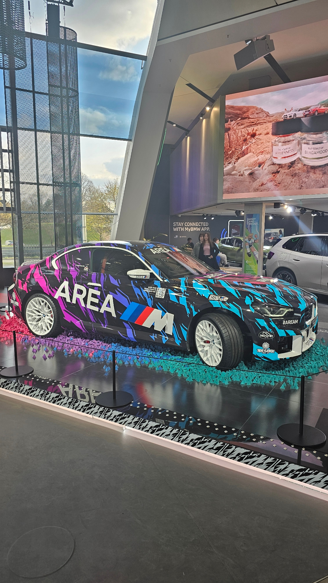 The image depicts a BMW M4 art car on display in Munich, Germany. The car has a unique wrap design with the word "AREA" prominently featured. The wrap features black, blue, purple, and pink colors, as…read more