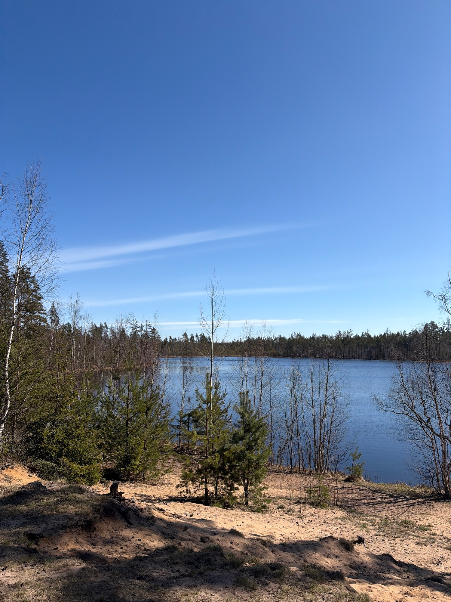 The image shows a view of Lake Peski in Russia on a sunny day. The lake is bordered by a forest on one side and a sandy beach or dune on the other. The sky is blue with some cloud trails. Several pine…read more