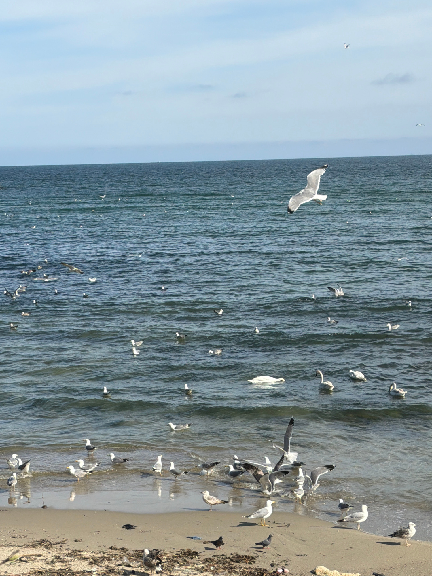 This image captures a vibrant coastal scene at a beach in Varna, Bulgaria, teeming with seagulls. **Subjects:** The primary subjects are numerous seagulls, ranging from those in flight to others restβ¦read more