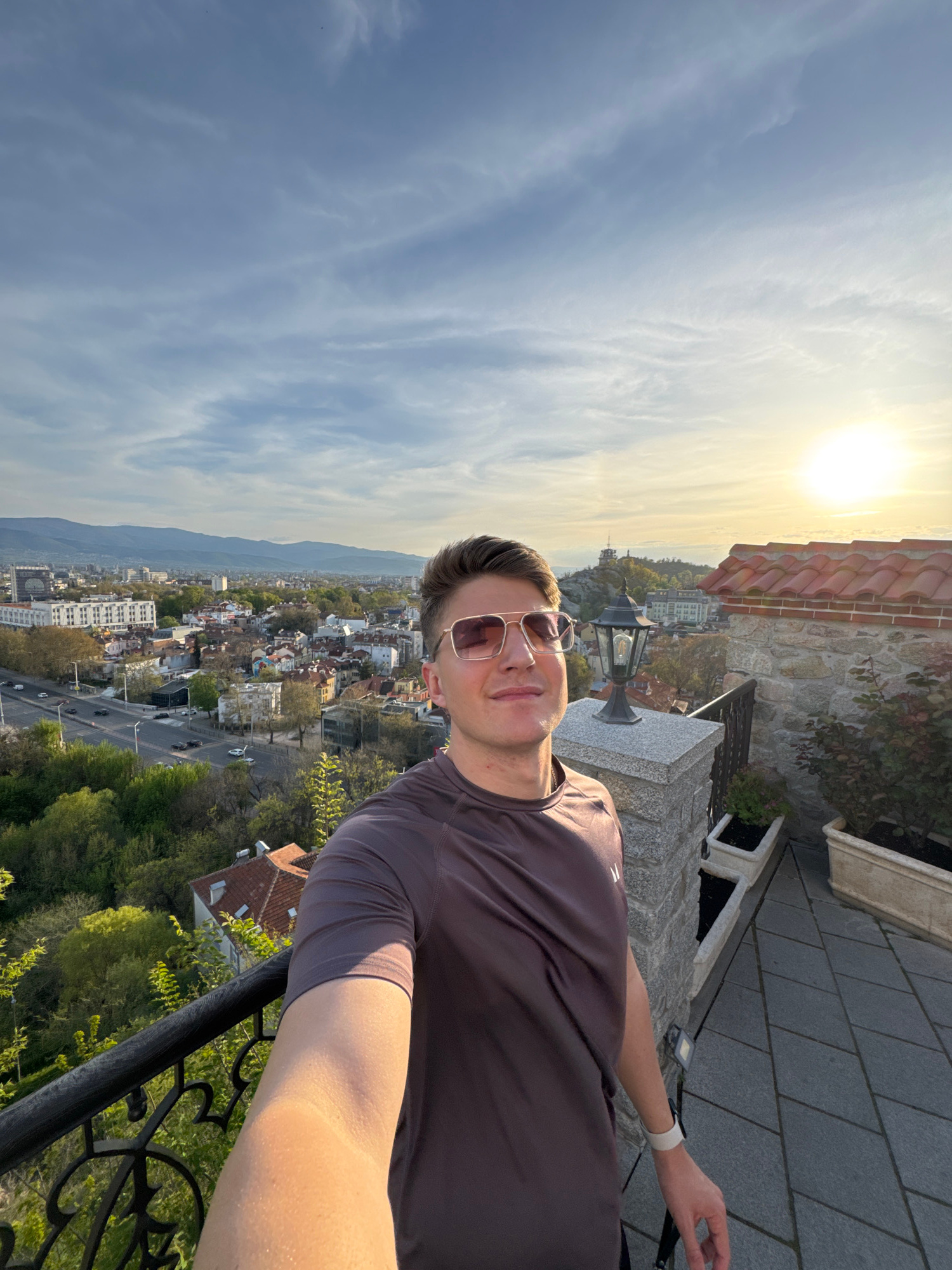 A man wearing sunglasses and a brown t-shirt is taking a selfie. He is standing on a balcony overlooking the city of Plovdiv, Bulgaria. The buildings in the city appear to be a mix of residential and…read more