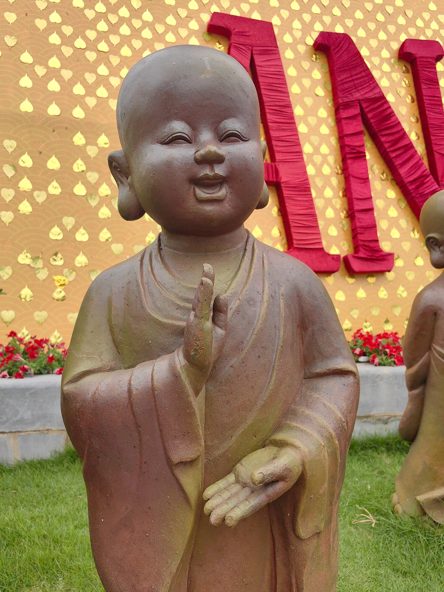 A serene outdoor scene is captured, focusing on a statue of a young Buddhist monk (a novice or "little monk") made of a reddish-brown material with subtle green highlights. The monk's face is round, w…read more
