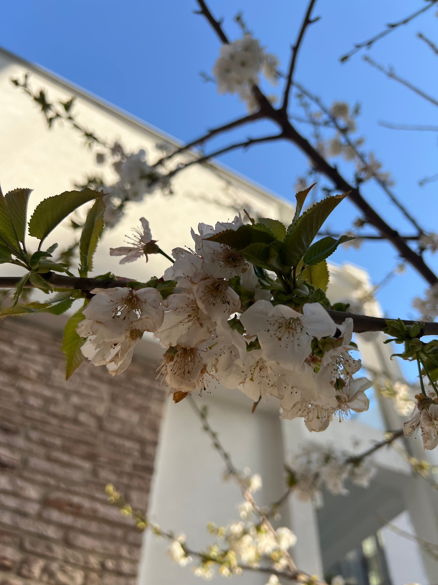 A close-up shot focuses on a cluster of white blossoms and green leaves on a branch, set against a partially obscured backdrop. The background includes a patch of clear blue sky visible at the top lef…read more