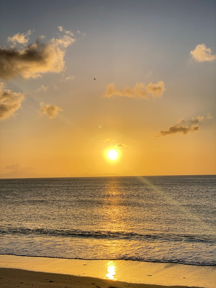 The image displays a sunset over a coastal area in Juan Griego, Venezuela. The scene is bisected horizontally by the horizon line, separating the sky from the ocean and beach. The sky, occupying the u…read more