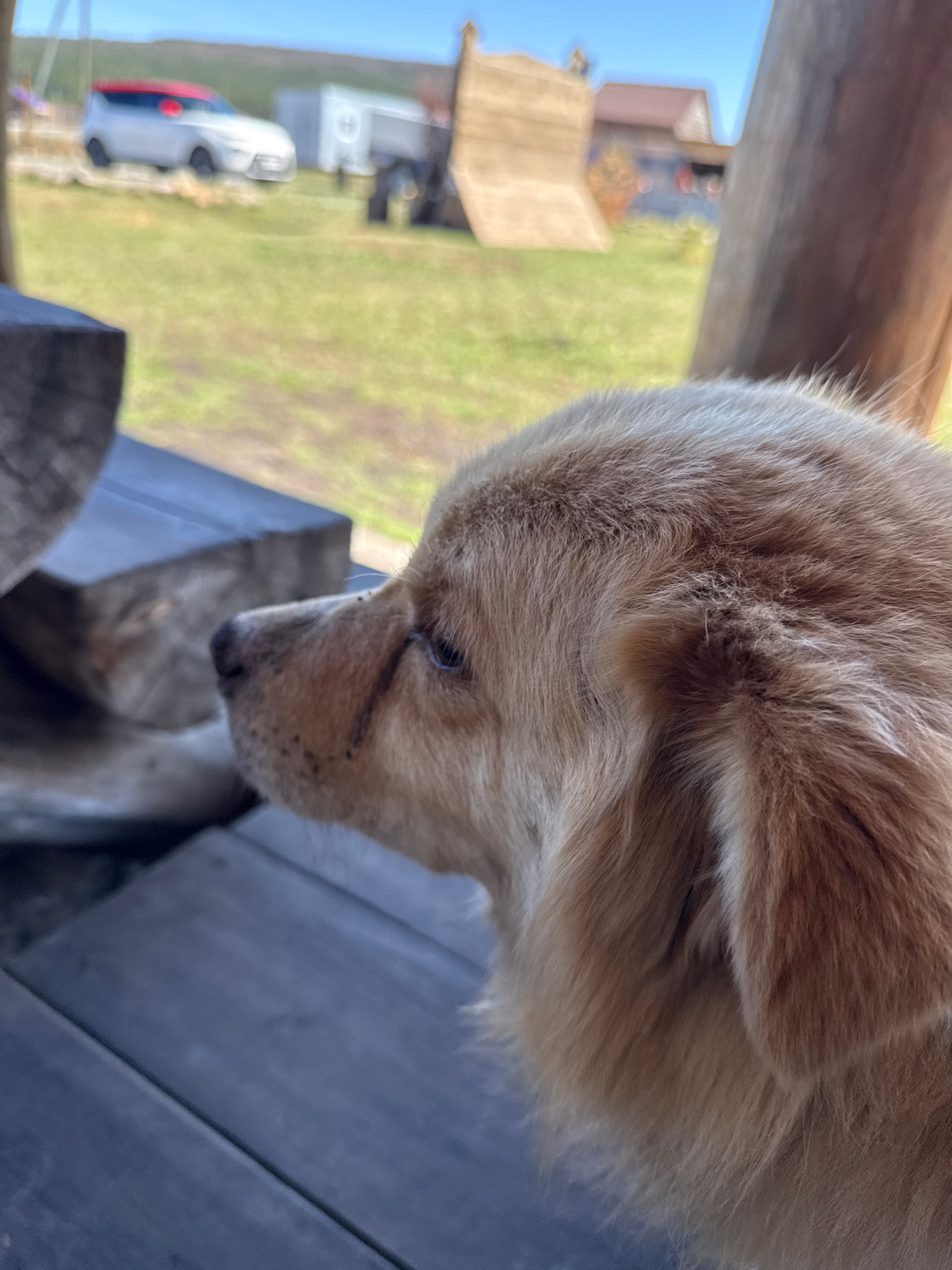 A close-up, slightly angled view shows the head and shoulders of a light-brown dog. The dog is looking downward, with a visible scar near its eye. The dog is sitting on a dark, wooden surface, possibl…read more