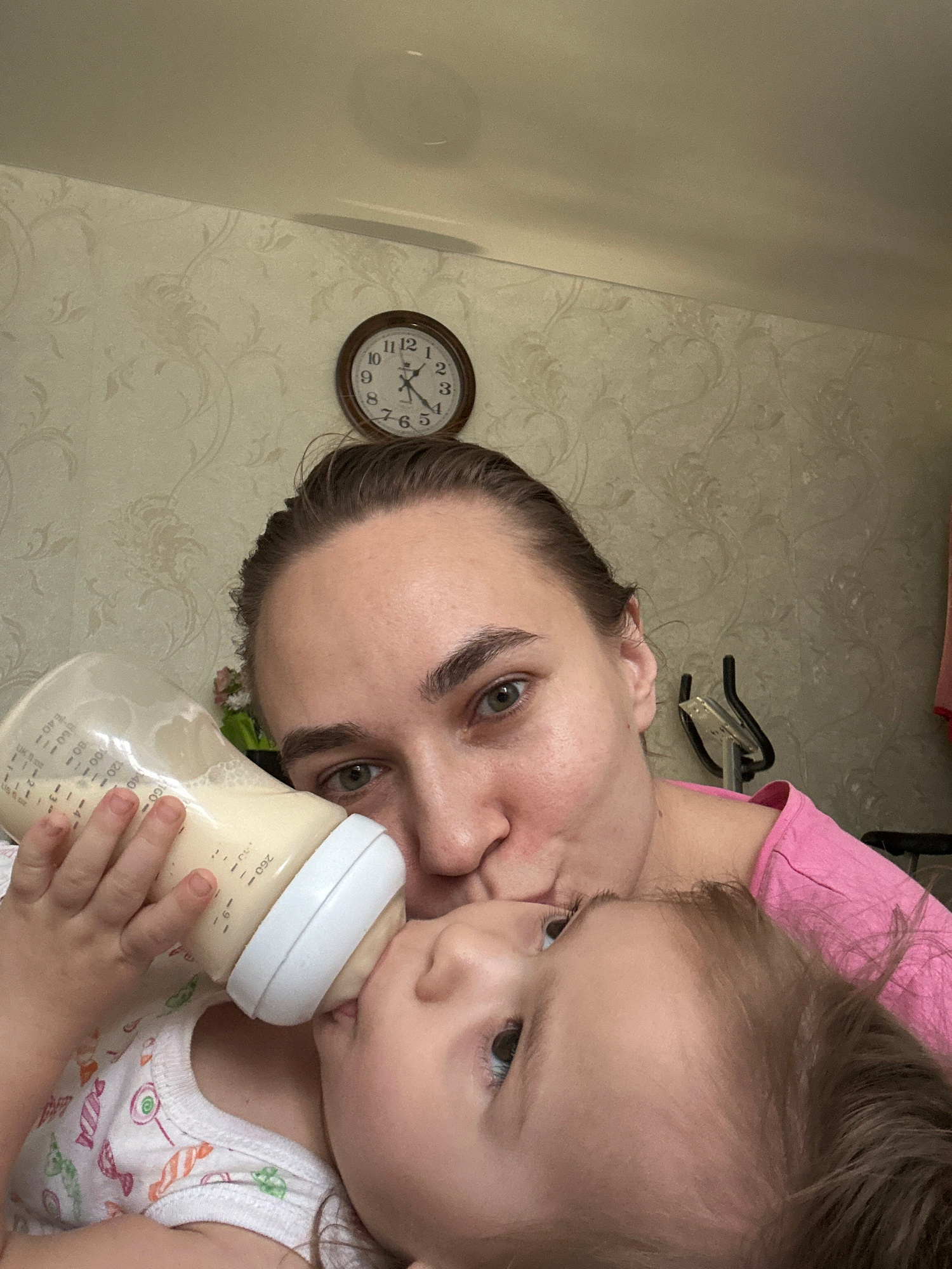 An adult and a young child are captured in a close-up, informal moment indoors in Uva, Russia. The image is taken at an angle, possibly a selfie. The adult, wearing a pink top, has brown hair pulled b…read more