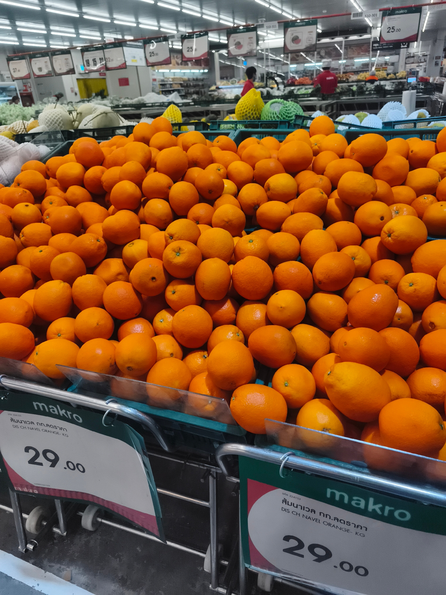This image shows a large display of oranges at a Makro store in Baan Bo Phut, Thailand. The oranges are piled high in a cart. The price is indicated as 29.00 per kilogram on two price tags. In the bac…read more
