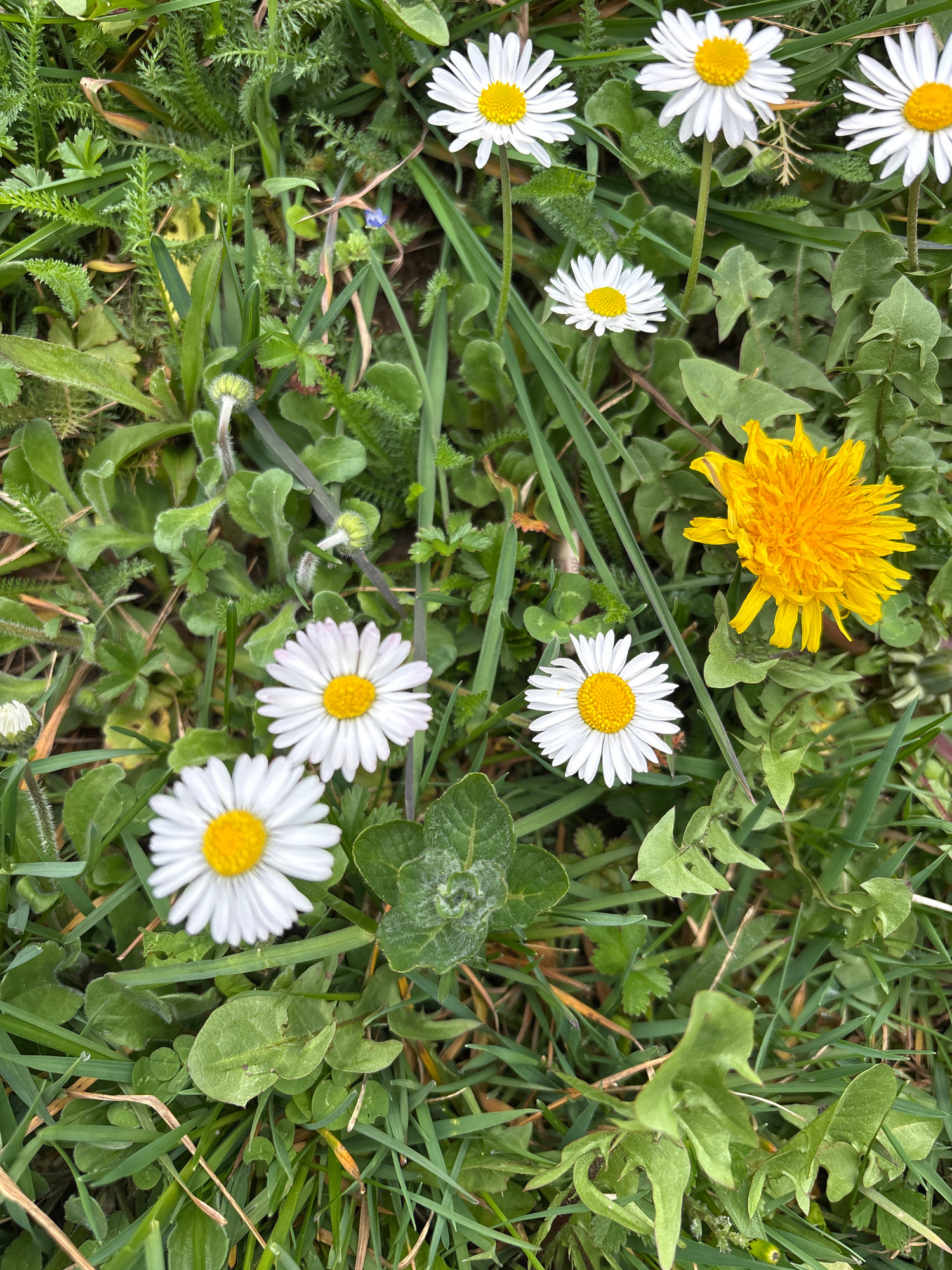 The image depicts a ground-level view of a patch of grass interspersed with various wildflowers. Several white daisies with yellow centers are scattered throughout the scene. A single dandelion, chara…read more