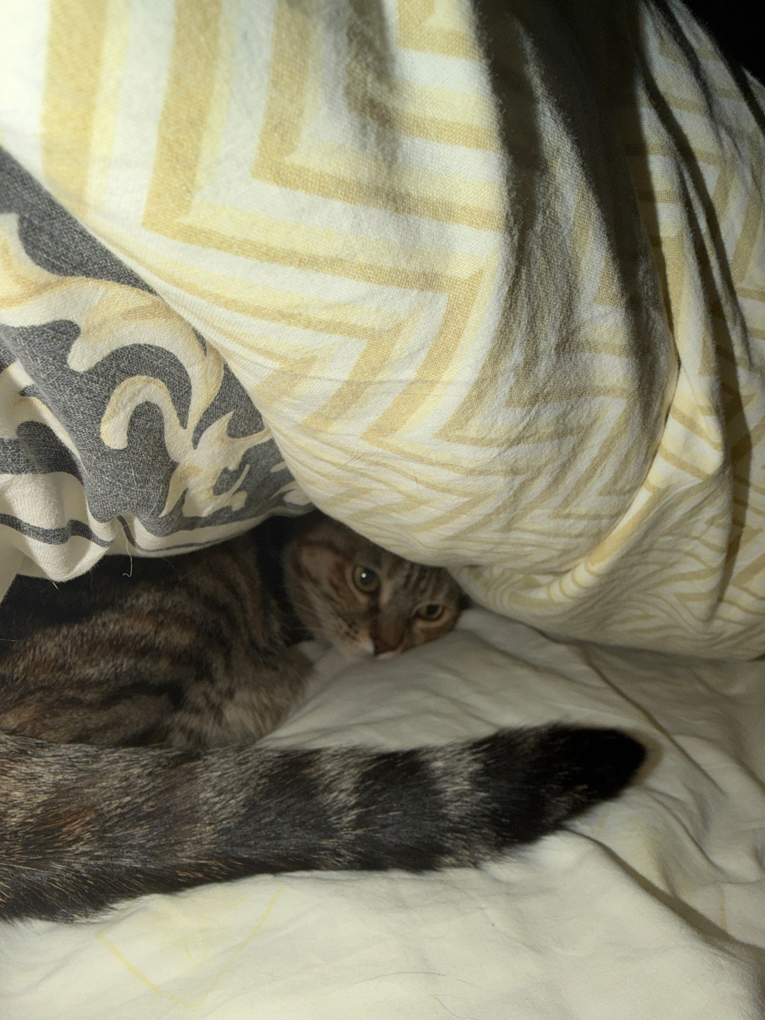 A tabby cat lies partially under patterned bedding. The cat's head is visible, with its eyes open and looking up. Its body is mostly obscured by the bedding, but its tail, which is thick and striped,…read more