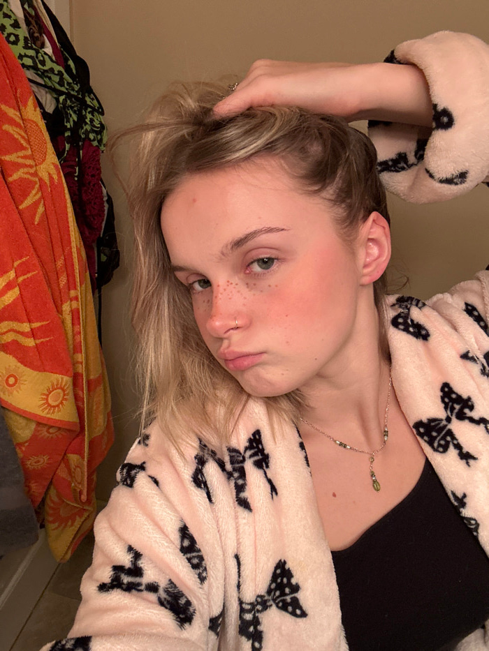 A fair-skinned person with freckles rests their head on a soft surface. They have light blonde hair, green eyes, and a nose ring. The person wears a pink bathrobe with black bow designs and a black to…read more