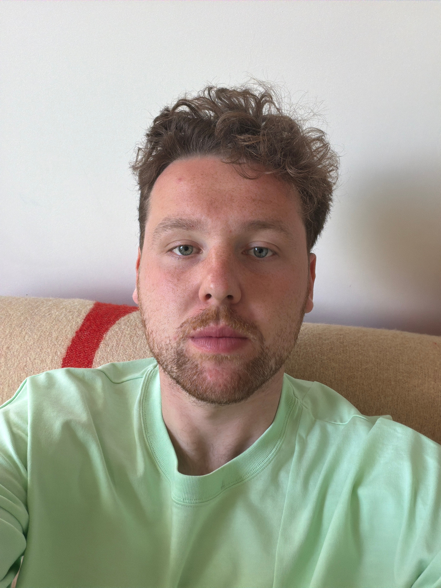 A medium shot depicts a fair-skinned man with freckles, light brown curly hair, and a short, trimmed beard. He has light-colored eyes and slightly pursed lips. He is wearing a light green long-sleeved…read more