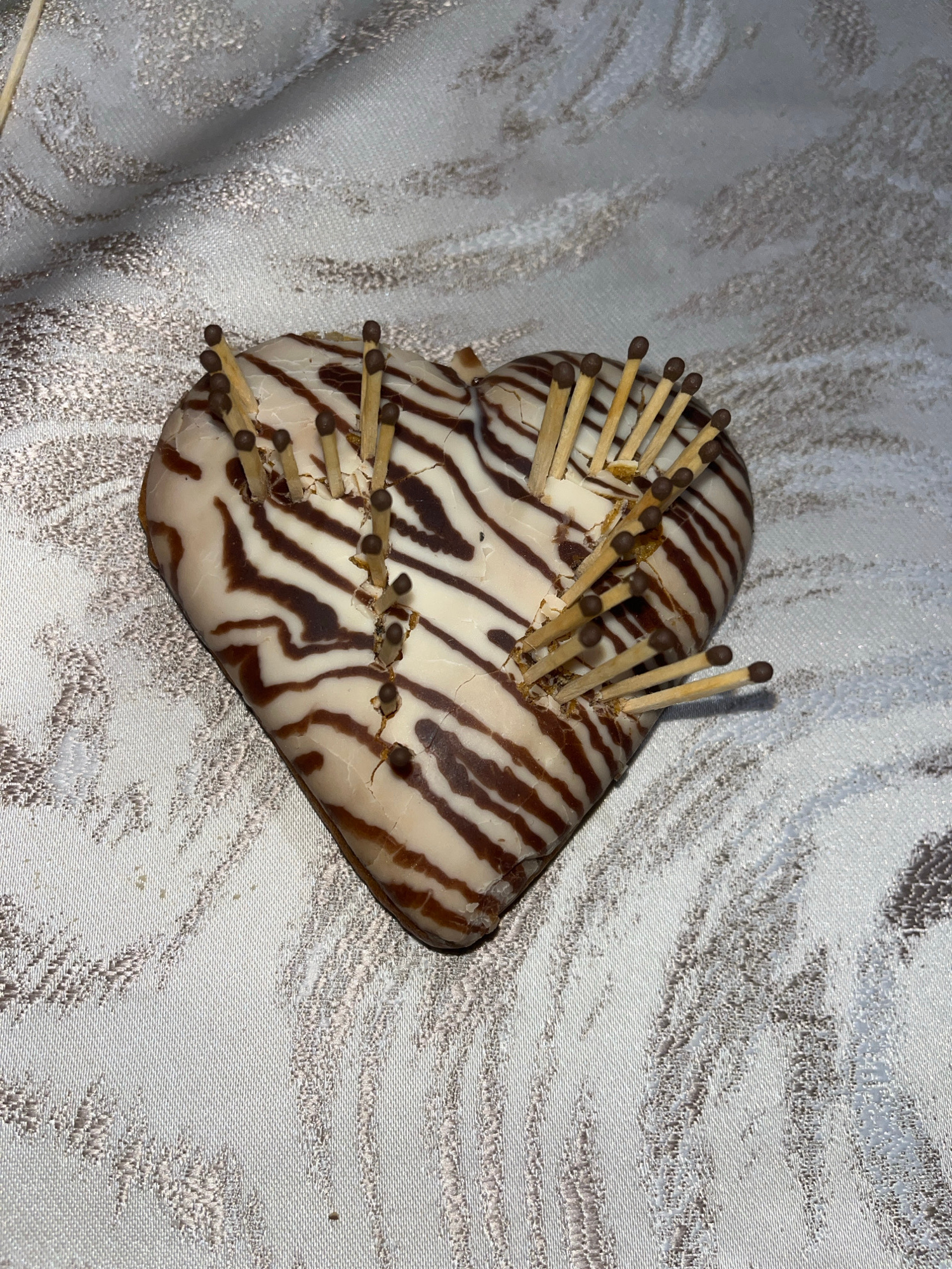 A heart-shaped object with brown and white zebra-like stripes is positioned on a light-colored fabric with a patterned texture. Multiple wooden matchsticks are stuck into the object, resembling needle…read more