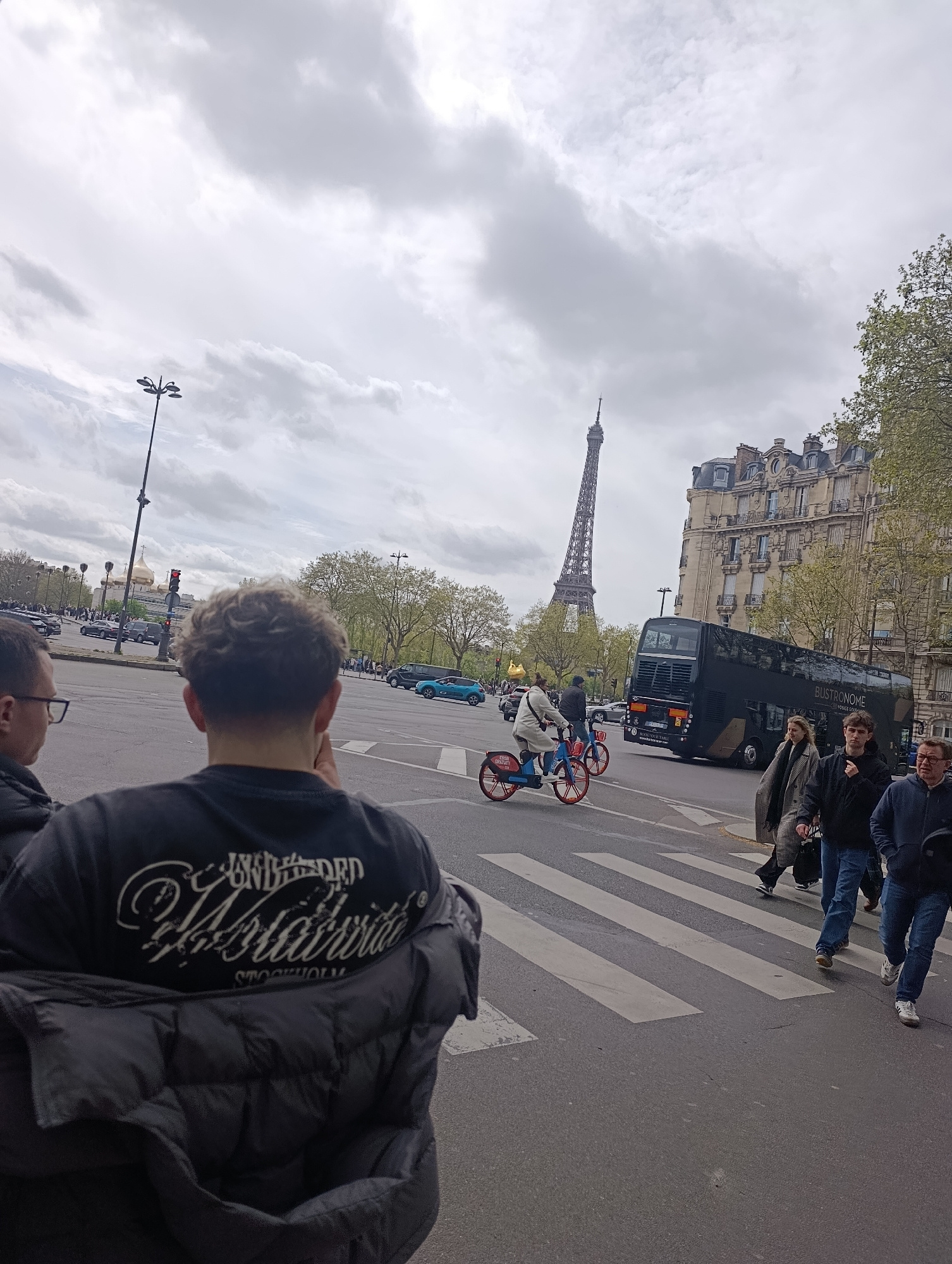 The image captures a street scene in Paris, France, with the Eiffel Tower visible in the background. In the foreground, a person wearing a black t-shirt and jacket stands with their back to the camera…read more