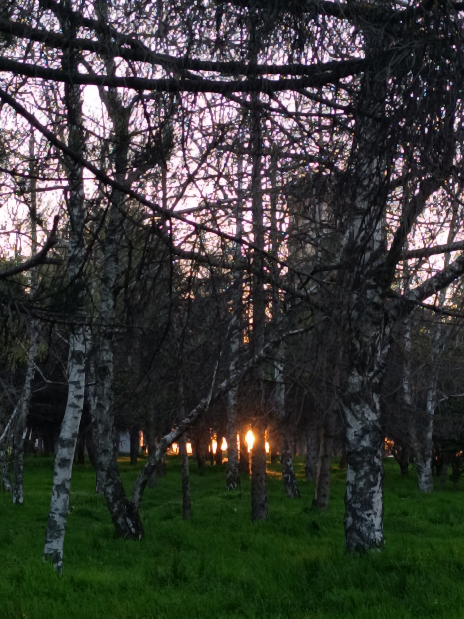 The image shows a dense grove of birch trees in what appears to be a park or wooded area. The trees have distinctive white bark with black markings, common to birch trees. The ground is covered in greβ¦read more