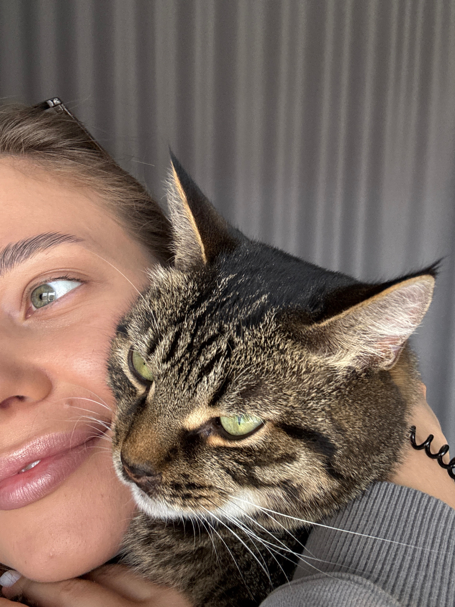 A close-up shot shows a fair-skinned person with light brown hair and green eyes looking directly at the camera, partially obscured by a brown tabby cat resting its head on the person's face. The cat…read more