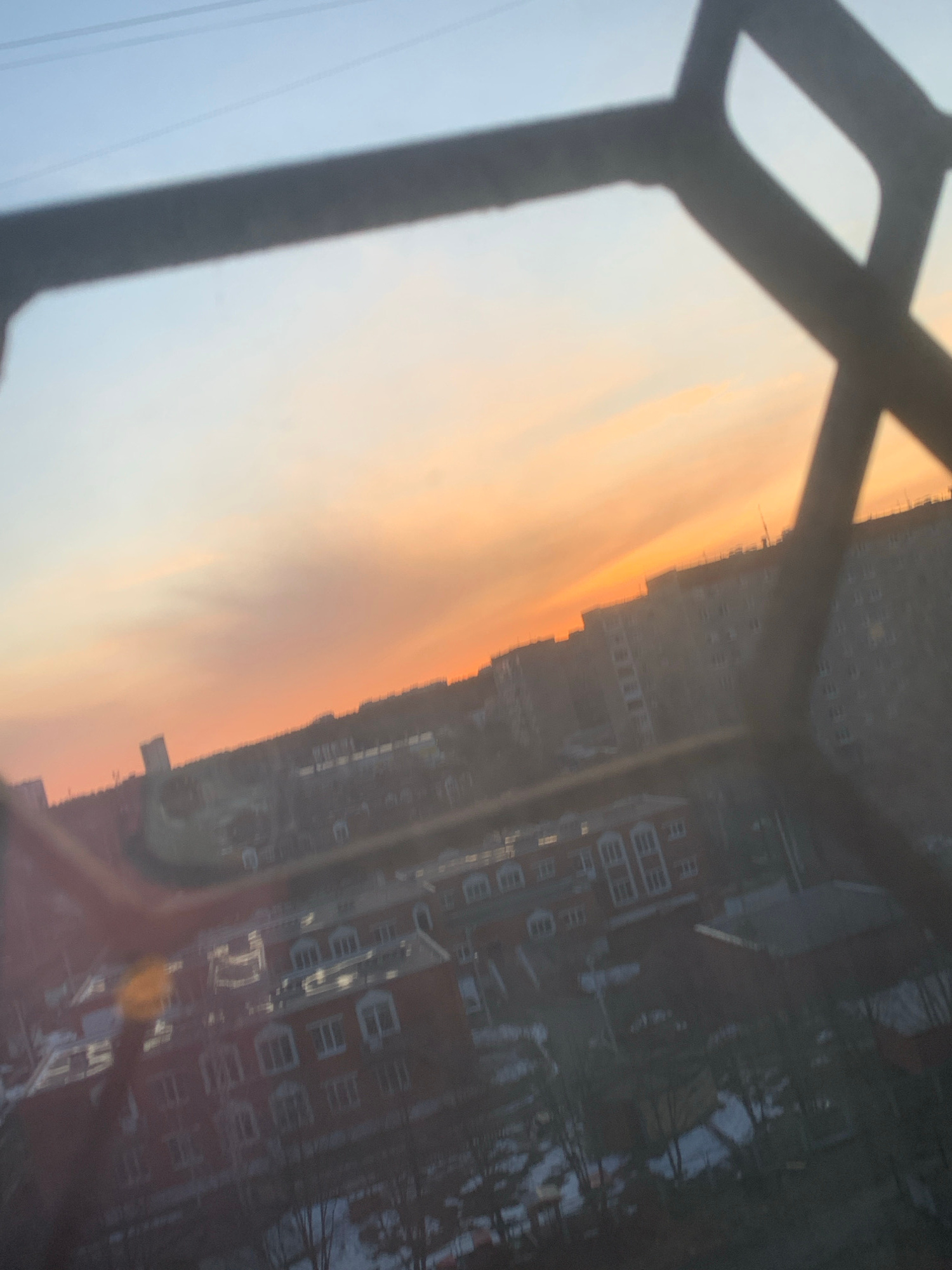 The image shows a view from a window with a metal frame. Outside, a cityscape is visible during what appears to be sunset or sunrise, given the orange-colored sky. Buildings with multiple windows are…read more
