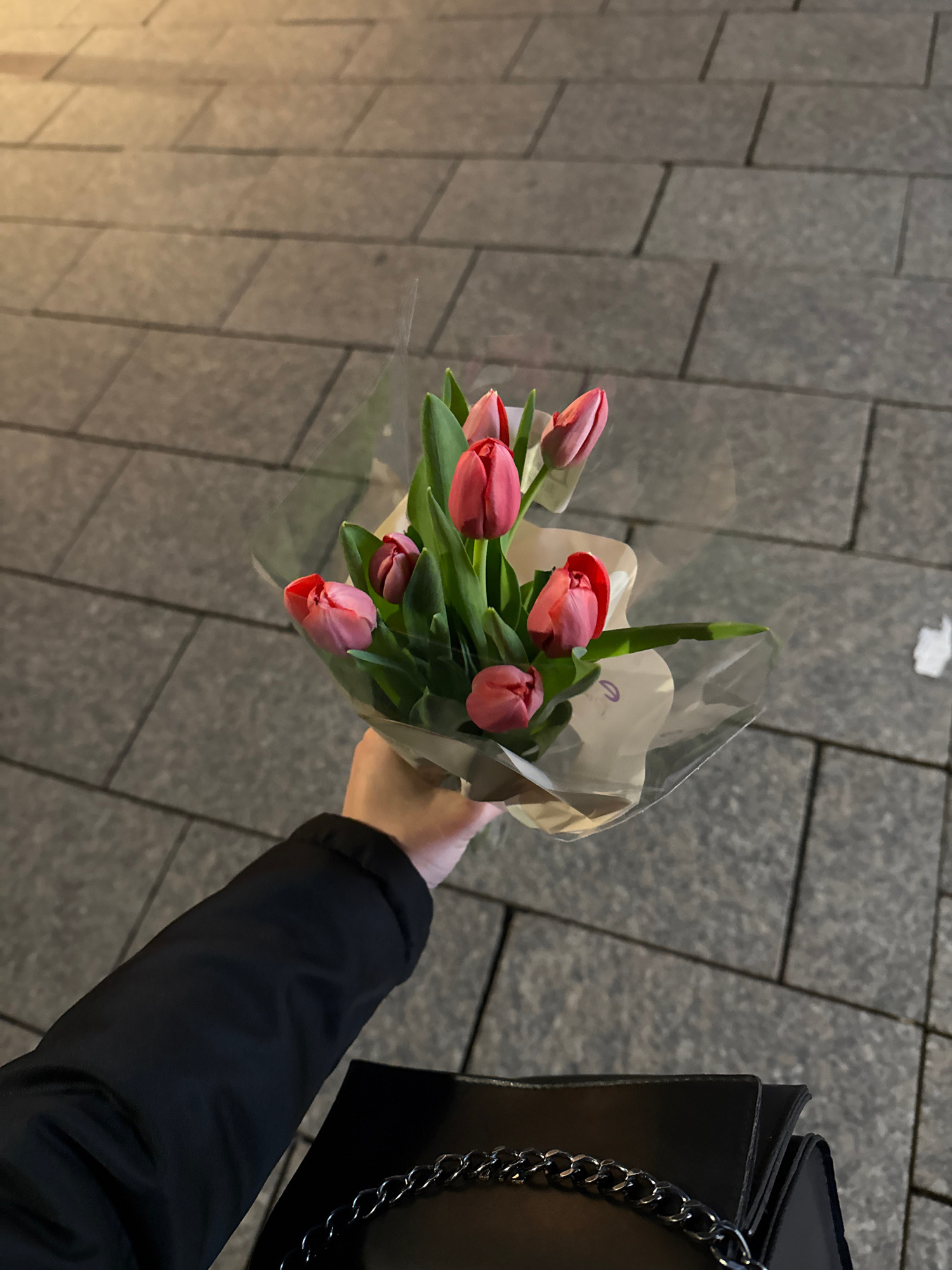 A forensic description of the image reveals a close-up, high-angle perspective of a human left hand holding a bouquet of tulips outdoors in Ulm, Germany. The hand, with light skin, emerges from a blacβ¦read more