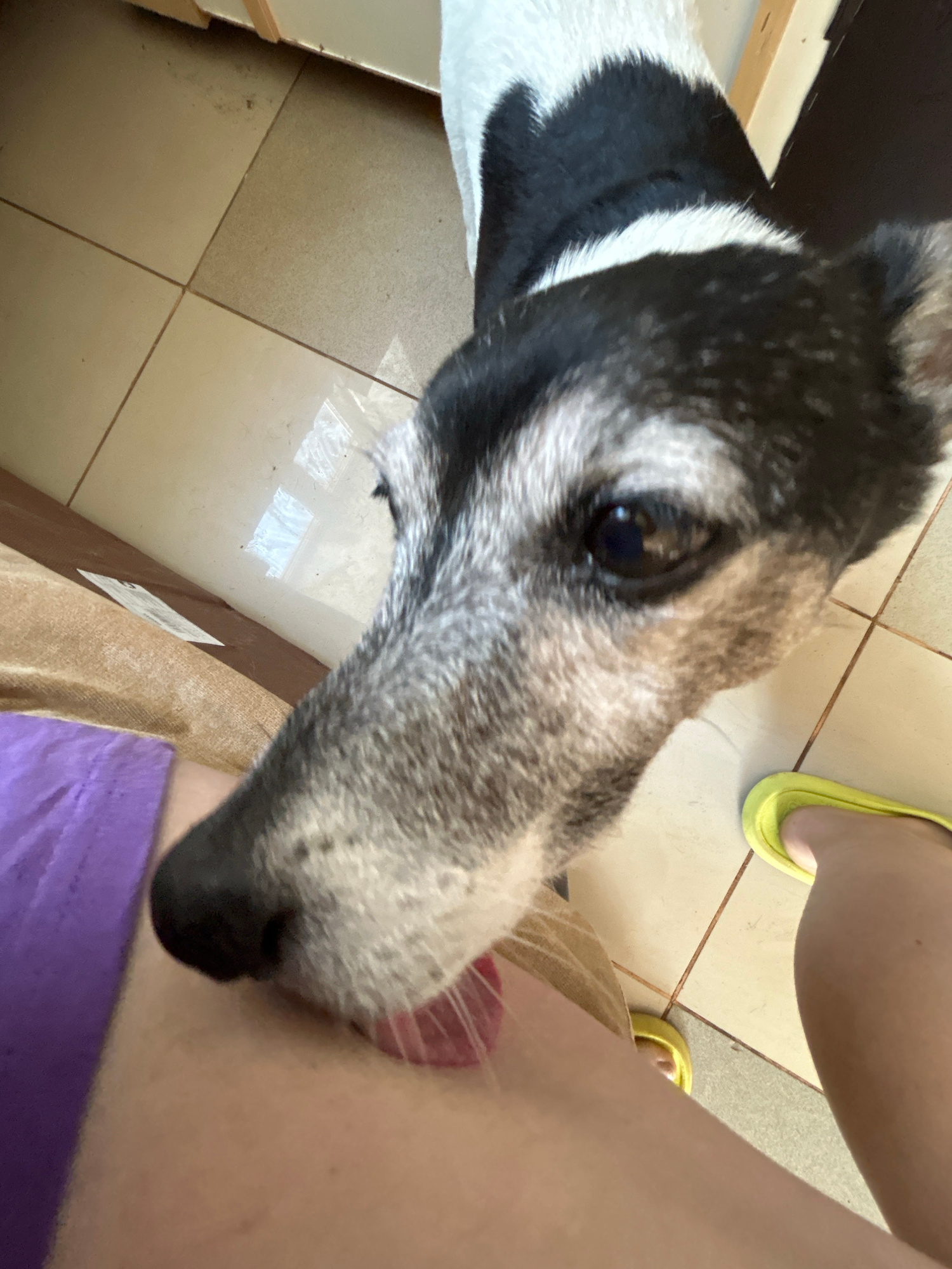 A close-up, tilted view focuses on a grey and white dog, its tongue extended as it licks a human's leg. The person is wearing yellow sandals and purple clothing. The setting appears to be indoors, wit…read more