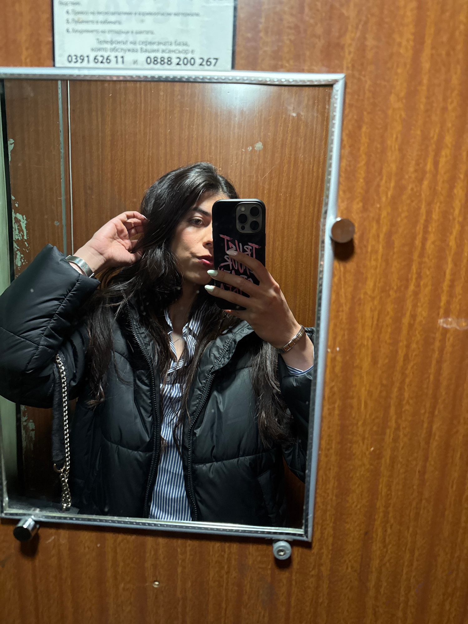 The image is a selfie taken in a mirror, likely a bathroom mirror, situated against a wooden wall. The mirror is rectangular with a silver frame. To the left of the mirror is a partially visible sign…read more