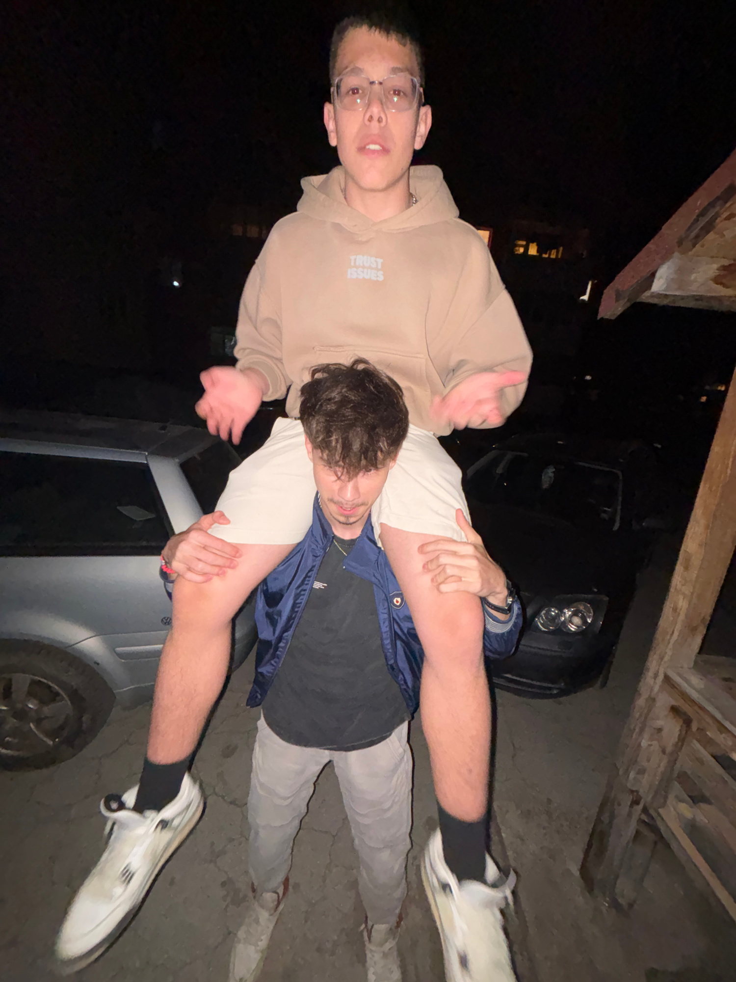 Two young men are posing for a photo outdoors at night. One man, wearing glasses and a beige hoodie with the words "TRUST ISSUES," is standing. The other man is being held horizontally across the firs…read more