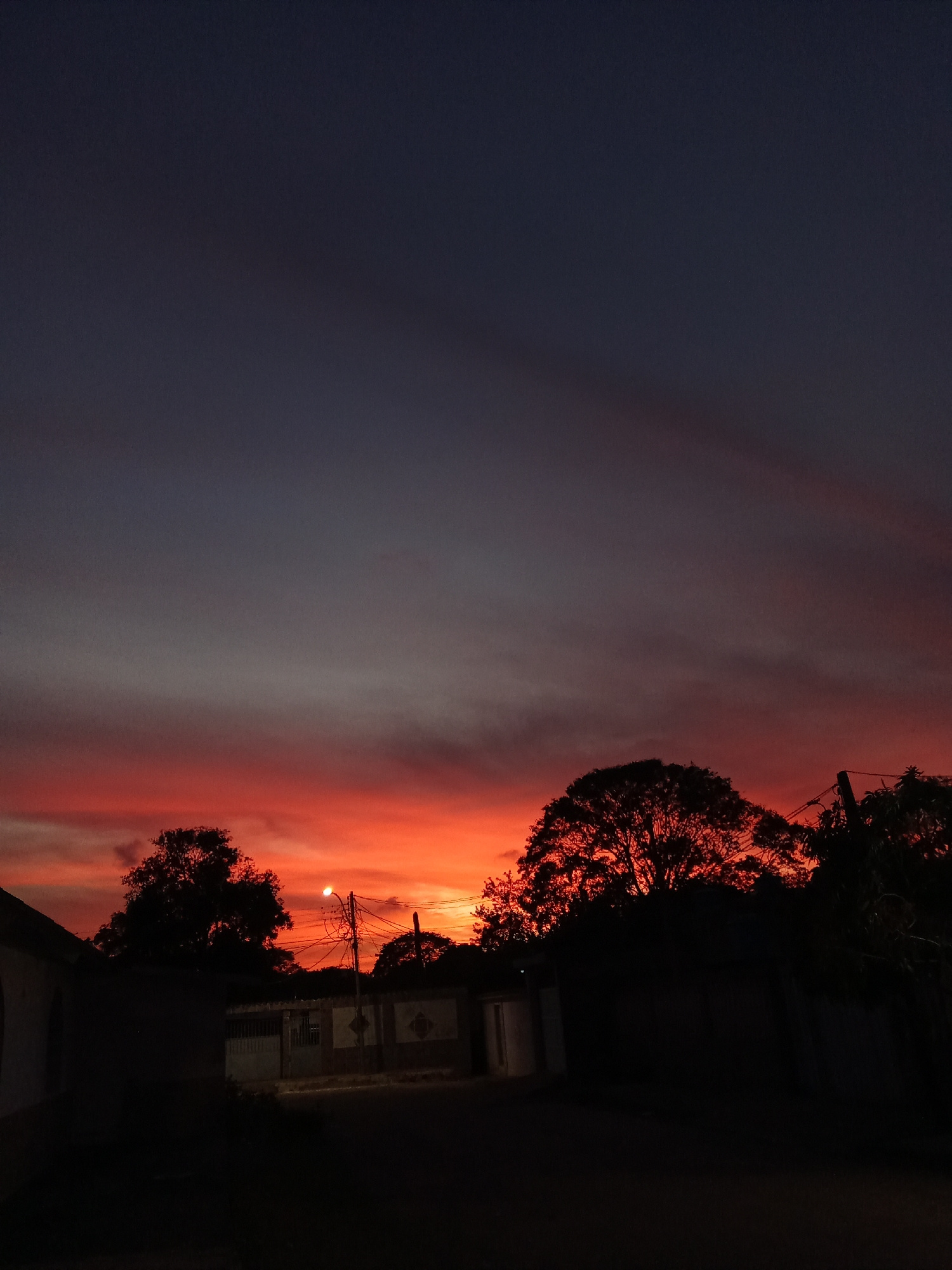 The image portrays a street scene at dusk in Juan Griego, Venezuela. The sky transitions from a deep blue-grey at the top to a vibrant orange and red band near the horizon, with dark cloud formations…read more