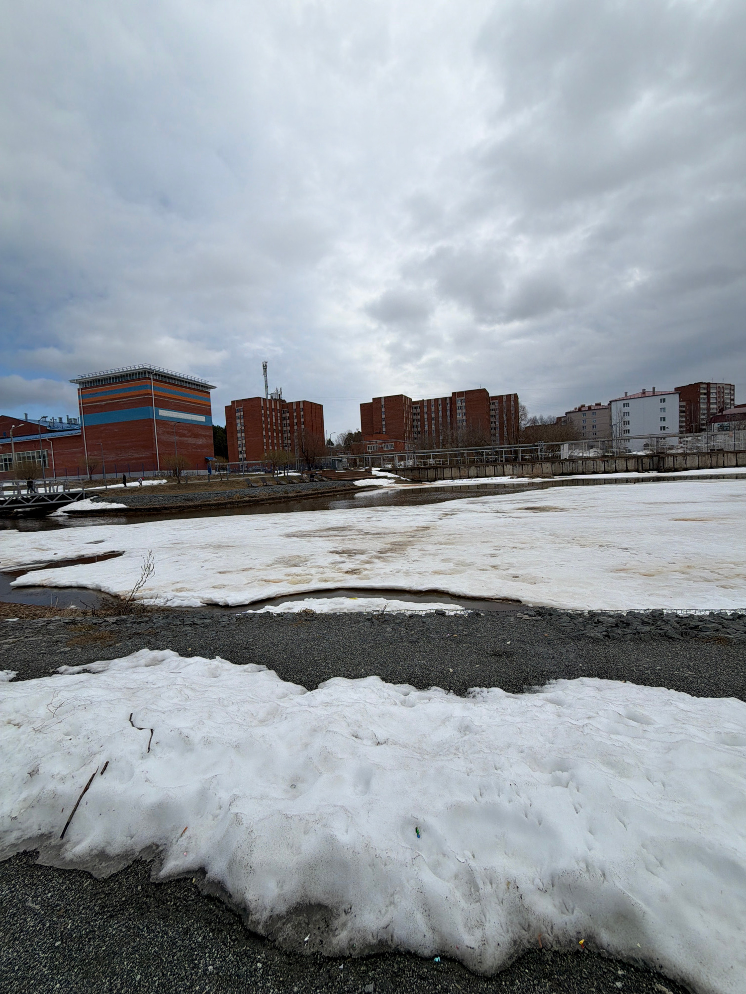 The image depicts a partially snow-covered landscape in Votkinsk, Russia, under a cloudy sky. Several brick buildings are visible in the background, including one with horizontal blue and orange stripβ¦read more
