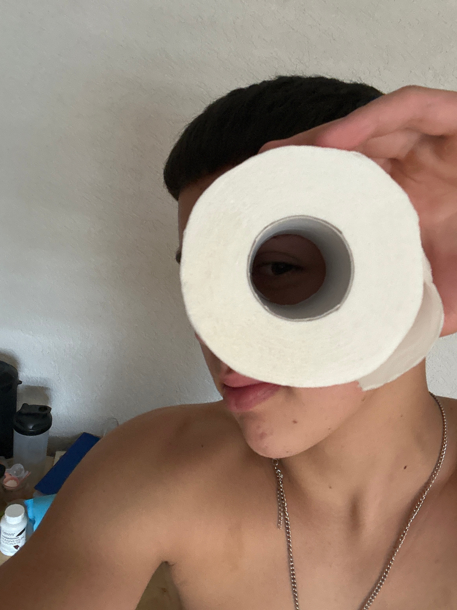 A person is holding a roll of toilet paper up to their eye. The person has dark hair and a silver chain around their neck. The background is a white wall and some cleaning supplies on the floor. There…read more