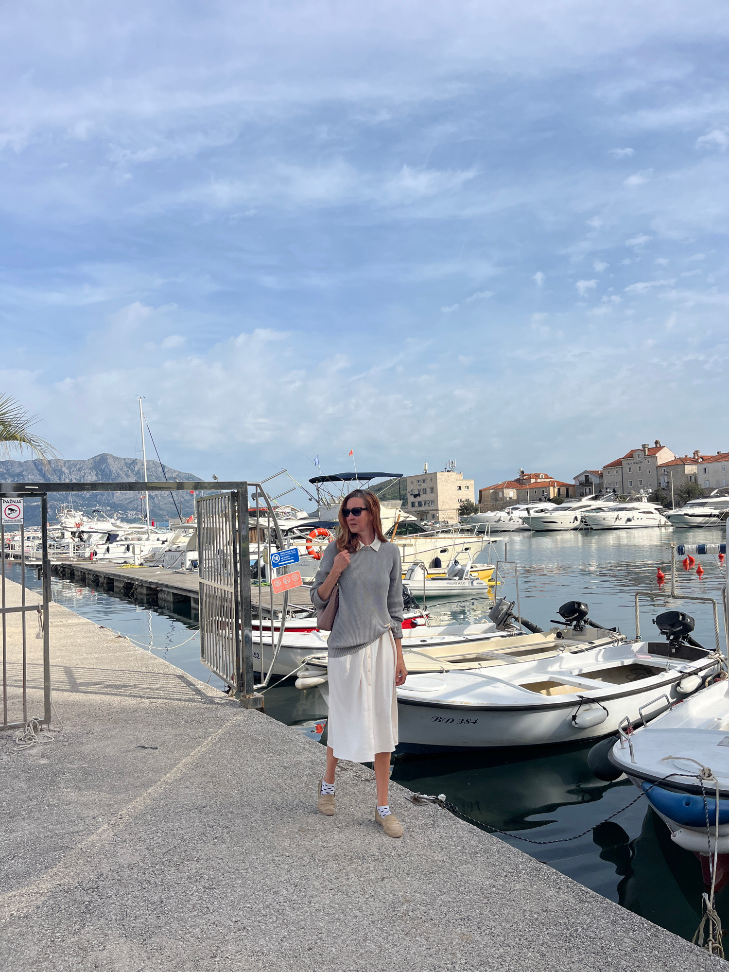 A woman stands on a concrete pier next to docked boats at the marina in Budva, Montenegro. She is wearing sunglasses, a gray sweater, and a white skirt. The sky is partially cloudy and there are mount…read more